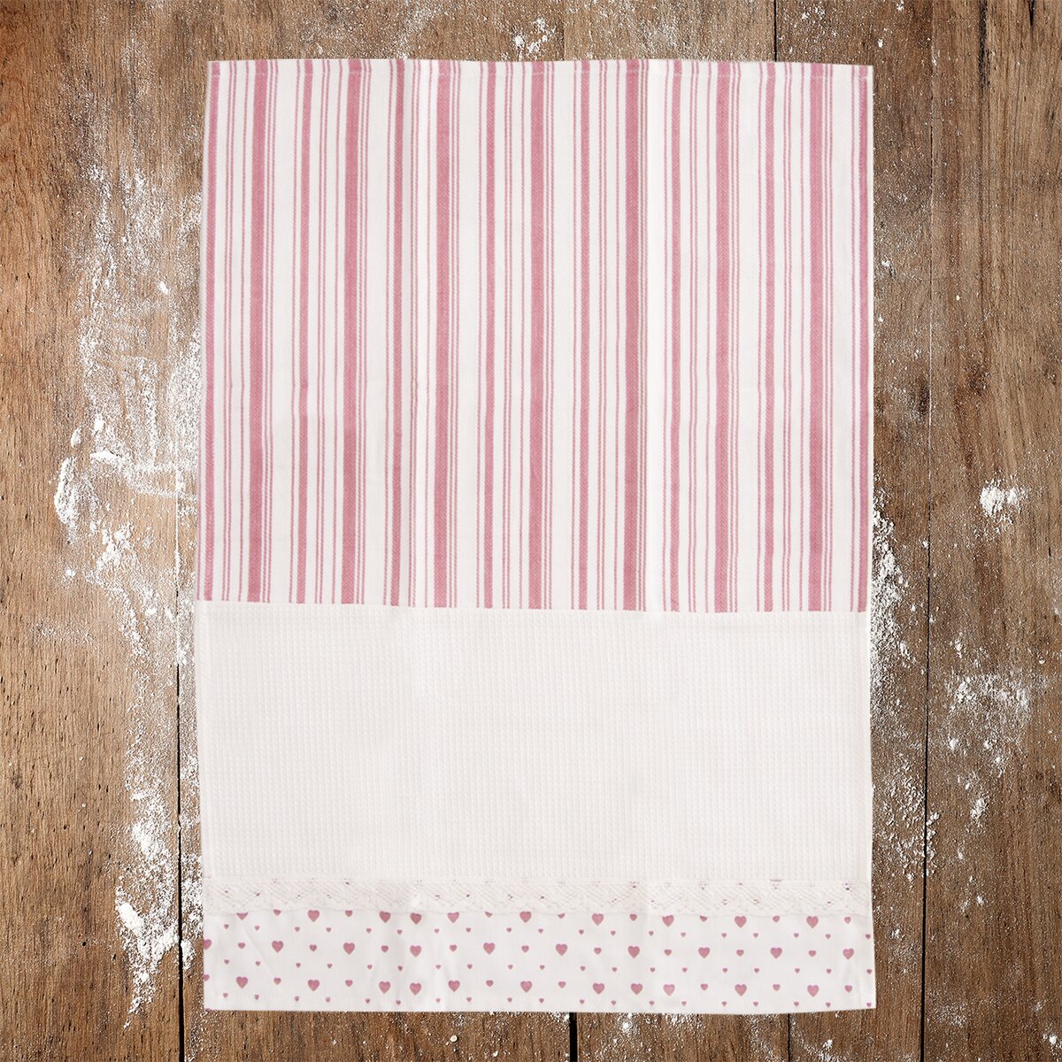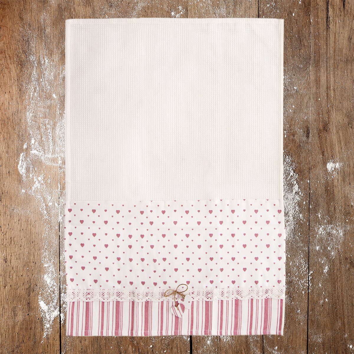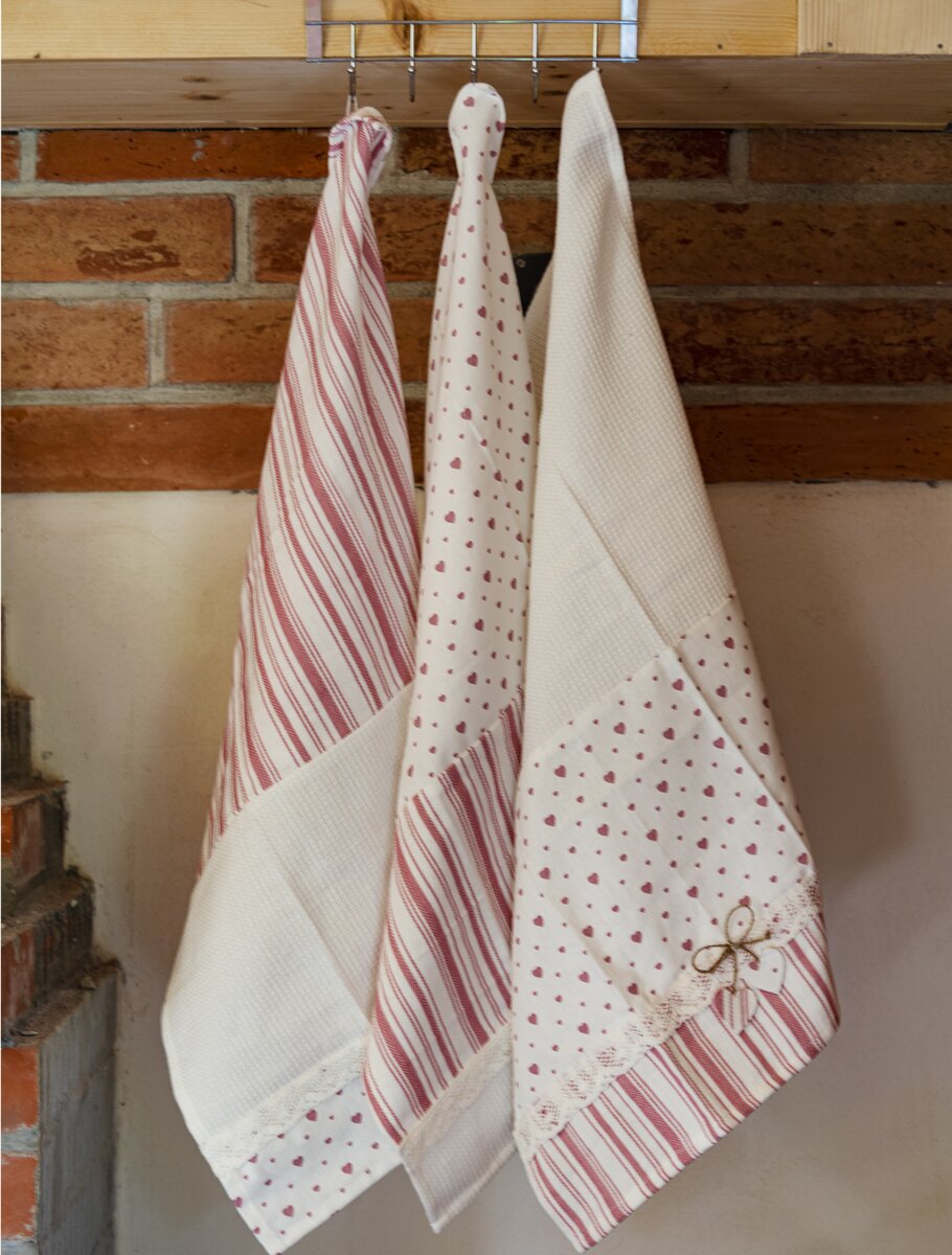 Spojenie prúžkov so vzorom drobných srdiečok sa hodí nielen na chaty alebo chalupy, ale aj do modernej kuchyne. Všetky utierky sú navyše vybavené pútkami na zavesenie.