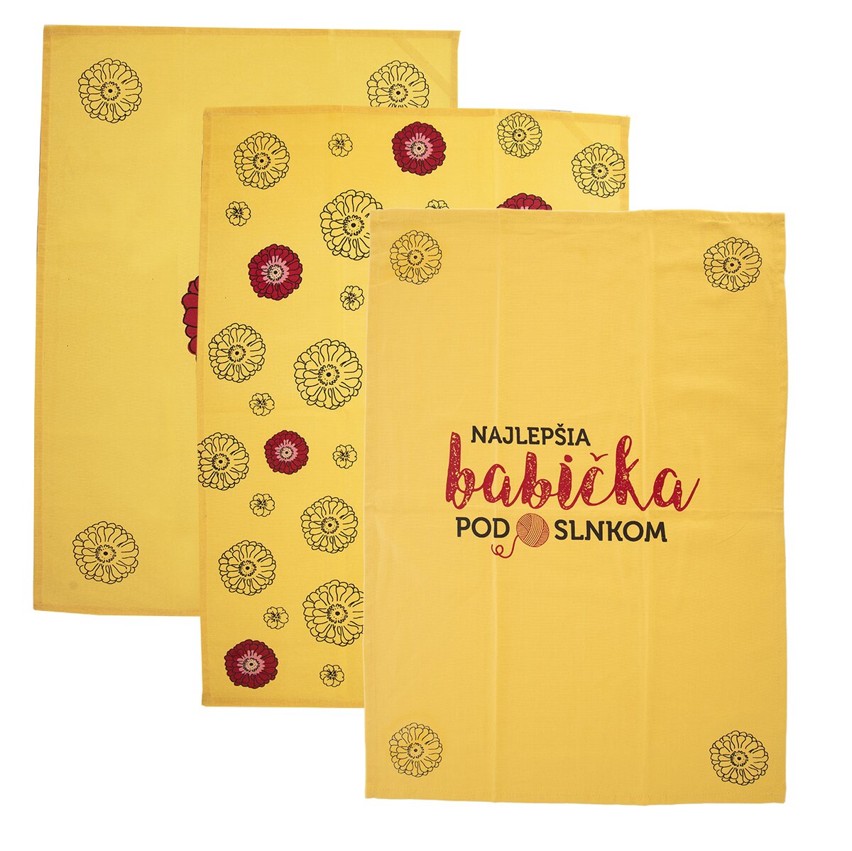 Kód produktu 710980Tri kusy štýlových bavlnených utierok NAJLEPŠIA BABIČKA POD SLNKOM, vhodných ako na utieranie riadu, tak aj ako pekný darček babičke.