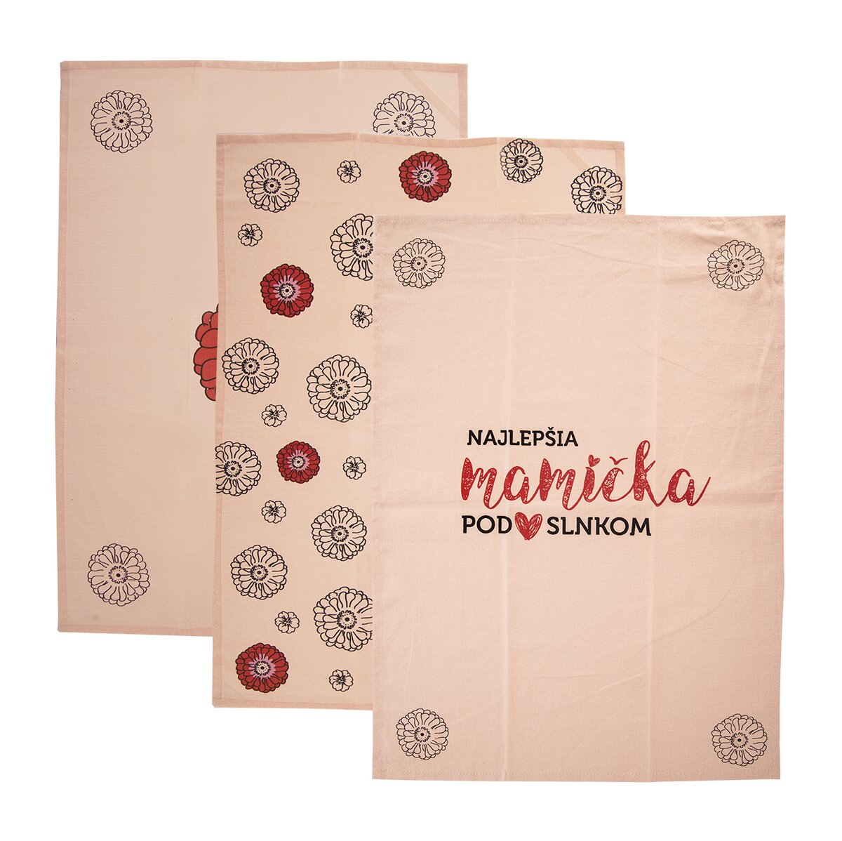Kód produktu 710981Tri kusy štýlových bavlnených utierok NAJLEPŠIA MAMIČKA POD SLNKOM, vhodných ako na utieranie riadu, tak aj ako pekný darček mamičke.