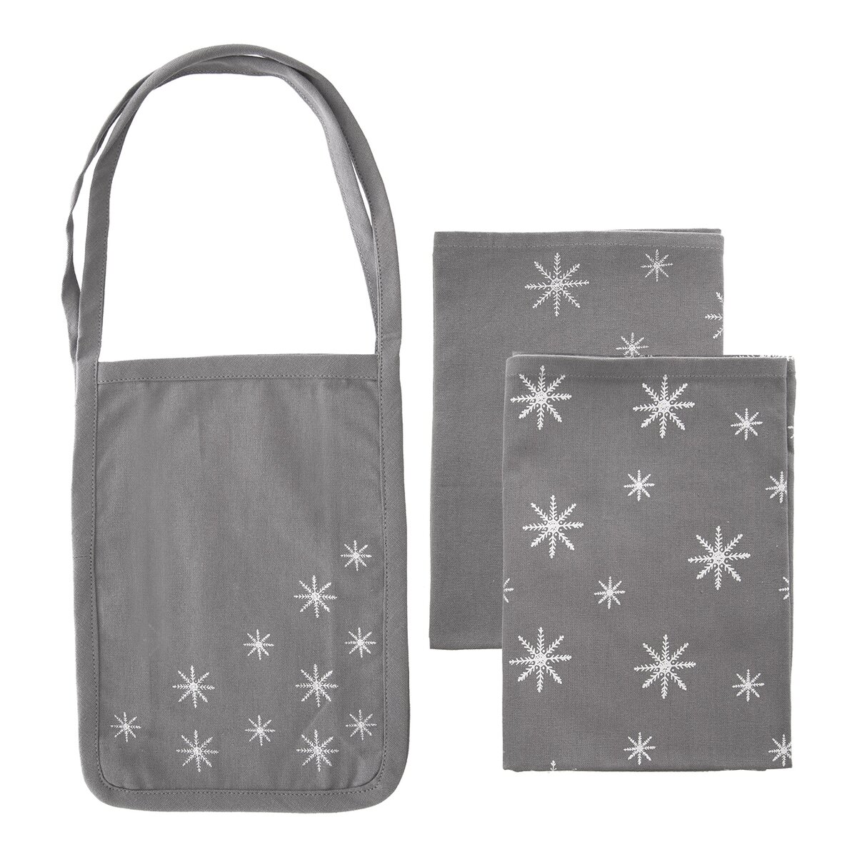 Kód produktu 710993Štýlová sada 2 šedých utierok v rozmere 70x50 cm a tašky s dekorom bielych vločiek je vyrobená zo 100% bavlny. Slúži ako pekný darček a potom aj ako praktický pomocník nielen v kuchyni.
