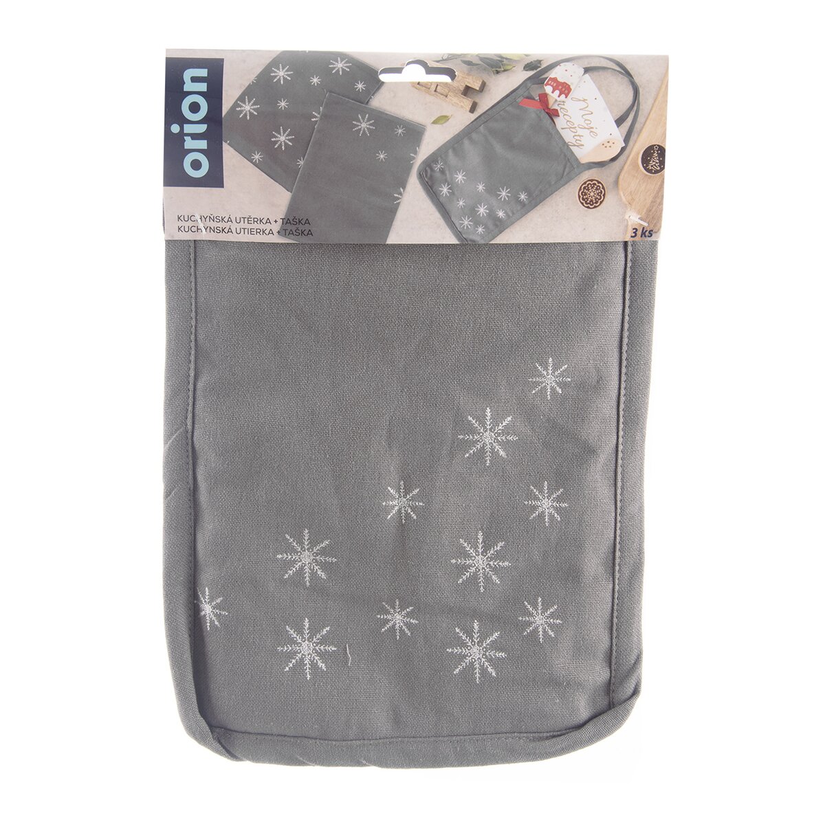Viac informáciíSada 2 kusov šedých utierok a tašky je vyrobená zo 100% bavlny a zdobí ju motív bielych snehových vločiek. Jedná sa o originálny dekor z dielne Orion dizajnérov. Bude praktickým darčekom, ktorý je možné využiť v domácnosti pri utieraní riadu či vyťahovaní horúceho riadu z rúry. Utierky je možné použiť aj ako menší obrus, naperón doprostred stola.