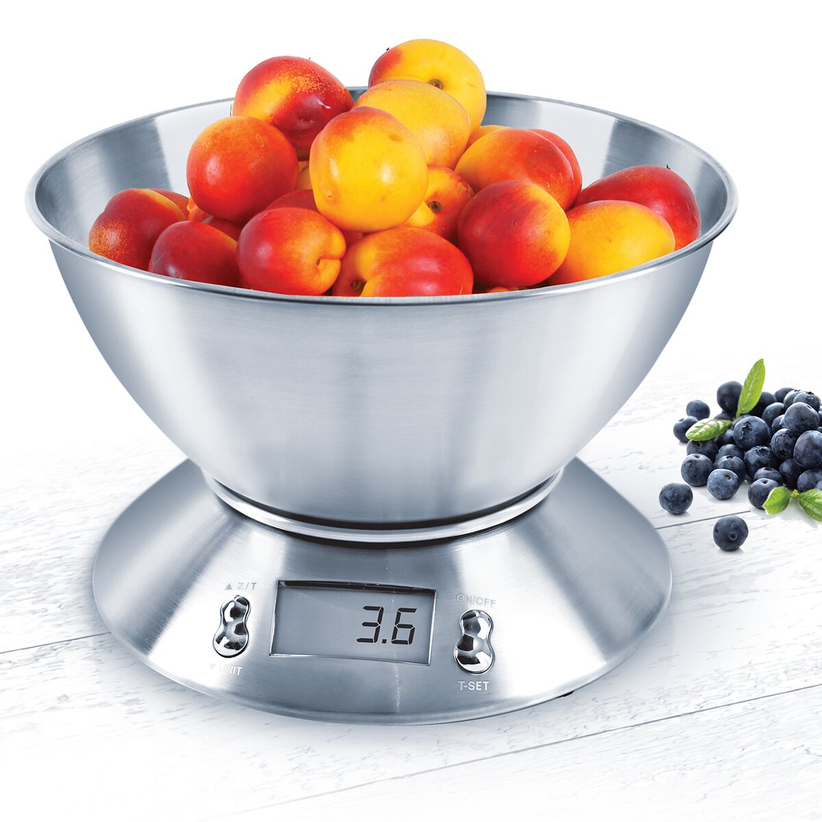 Kód produktu 130572Kuchynská digitálna váha s LCD displejom a odnímateľnou miskou z nerezu, s možnosťou vážiť v g a oz. Funkcia vynulovania a dovažovania funkciou TARE minútka a teplomer je súčasťou nastavenia.