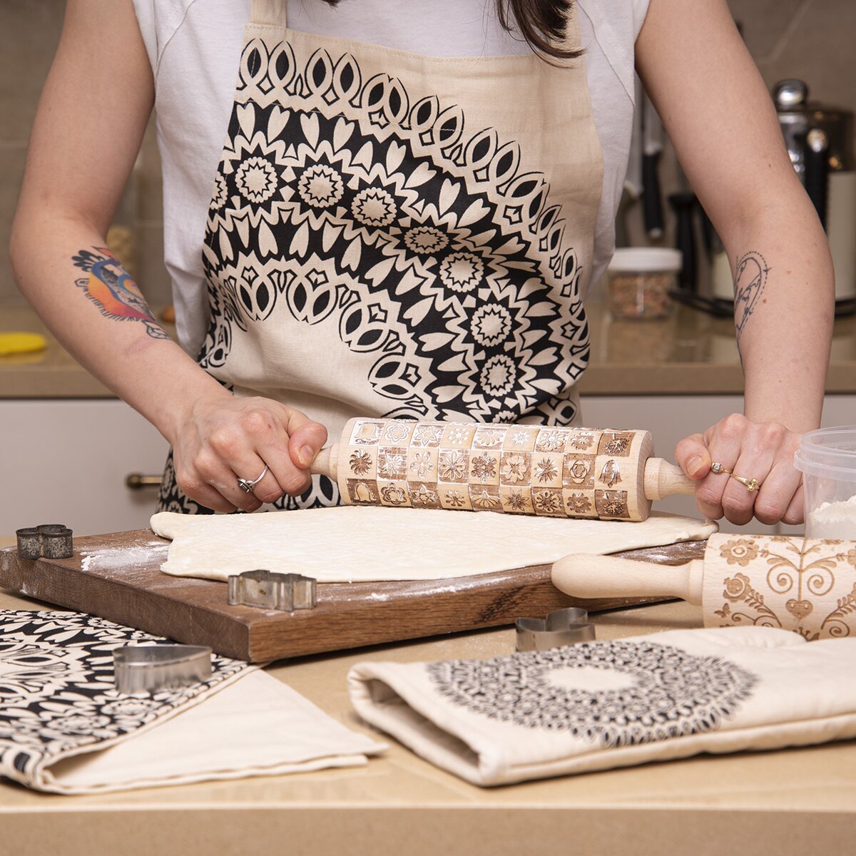 Zdobí ju výrazná mandala, populárny symbol predstavujúci vesmír, jednotu a harmóniu. Výhodou je aj nastaviteľné zaväzovanie okolo krku, vďaka čomu je vhodná pre rôzne vysoké kuchárky i kuchárov.