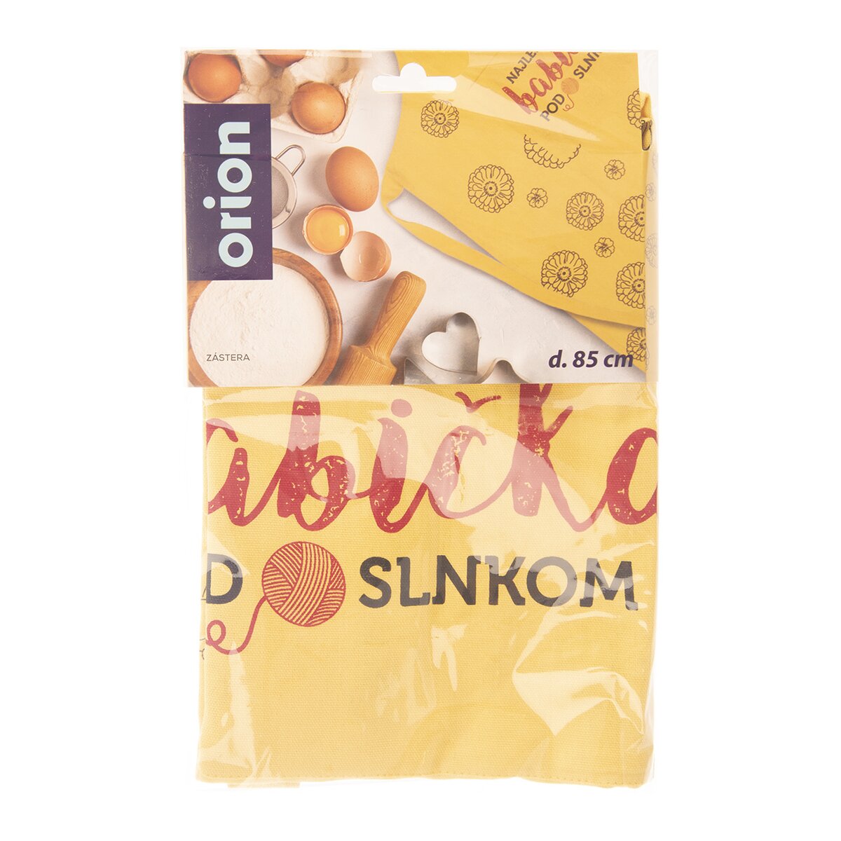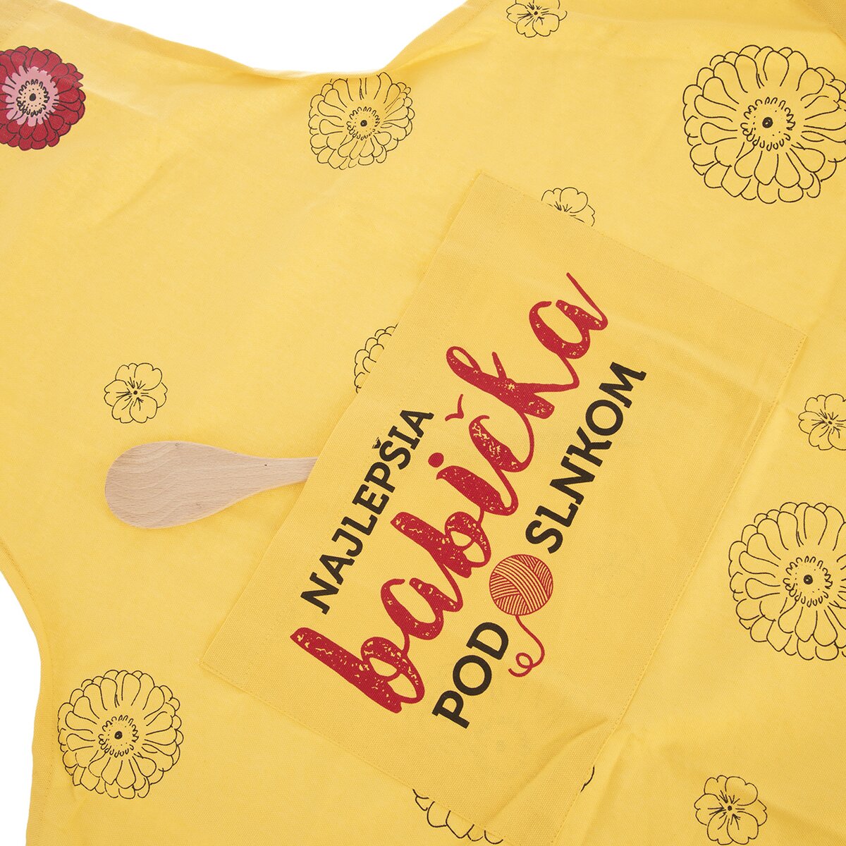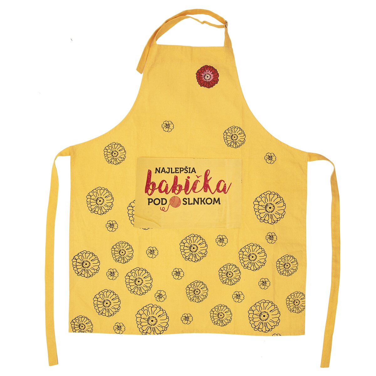 Kód produktu 960864Bavlnená zástera v žltej farbe, s kvetinovou potlačou a nápisom NAJLEPŠIA BABIČKA POD SLNKOM. Má vrecko a nastaviteľné viazanie okolo krku.