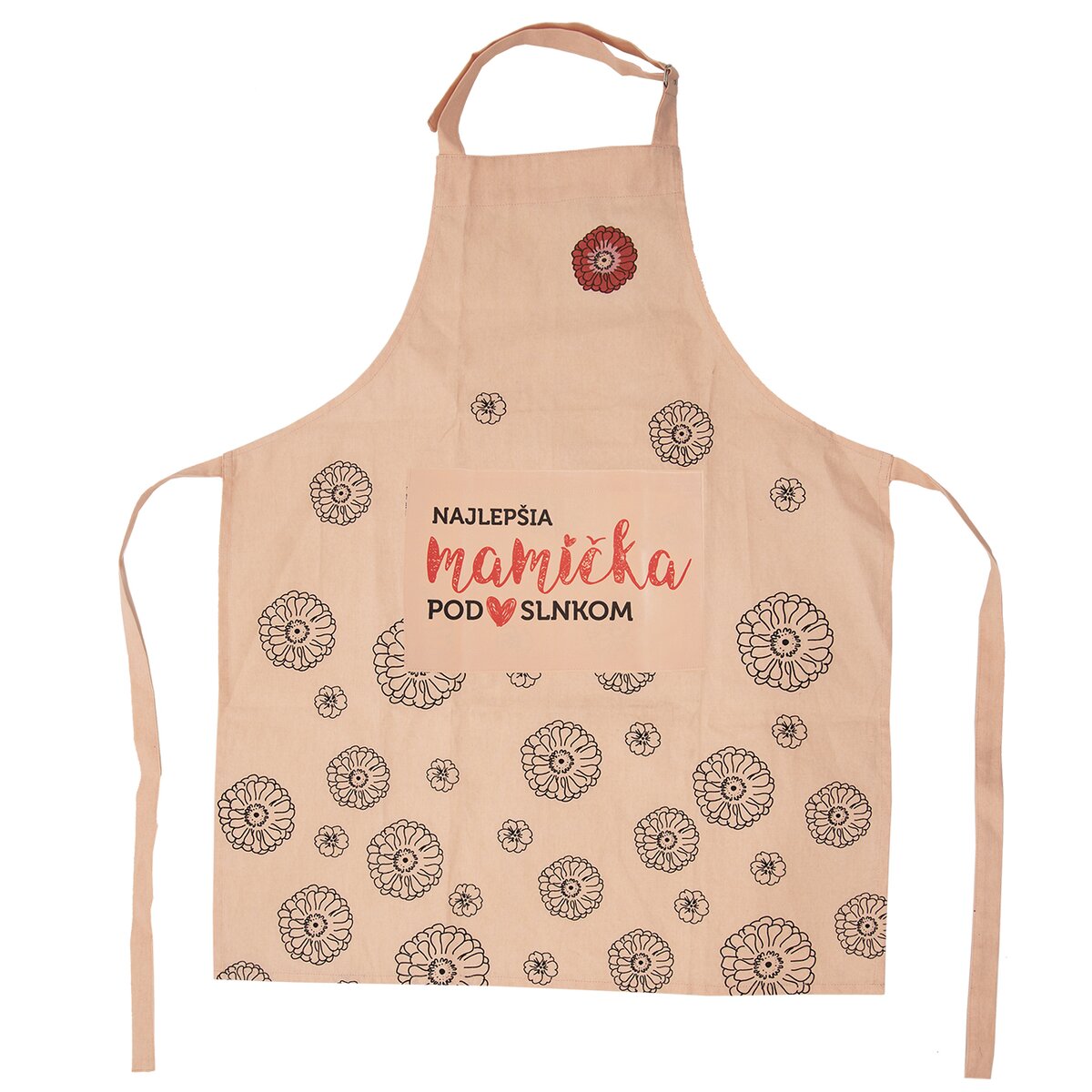 Kód produktu 960865Bavlnená zástera v marhuľovej farbe, s kvetinovou potlačou a nápisom NAJLEPŠIA MAMIČKA POD SLNKOM. Má vrecko a nastaviteľné viazanie okolo krku.