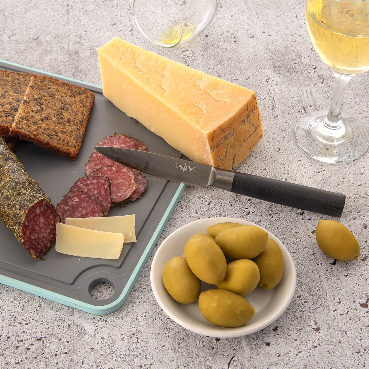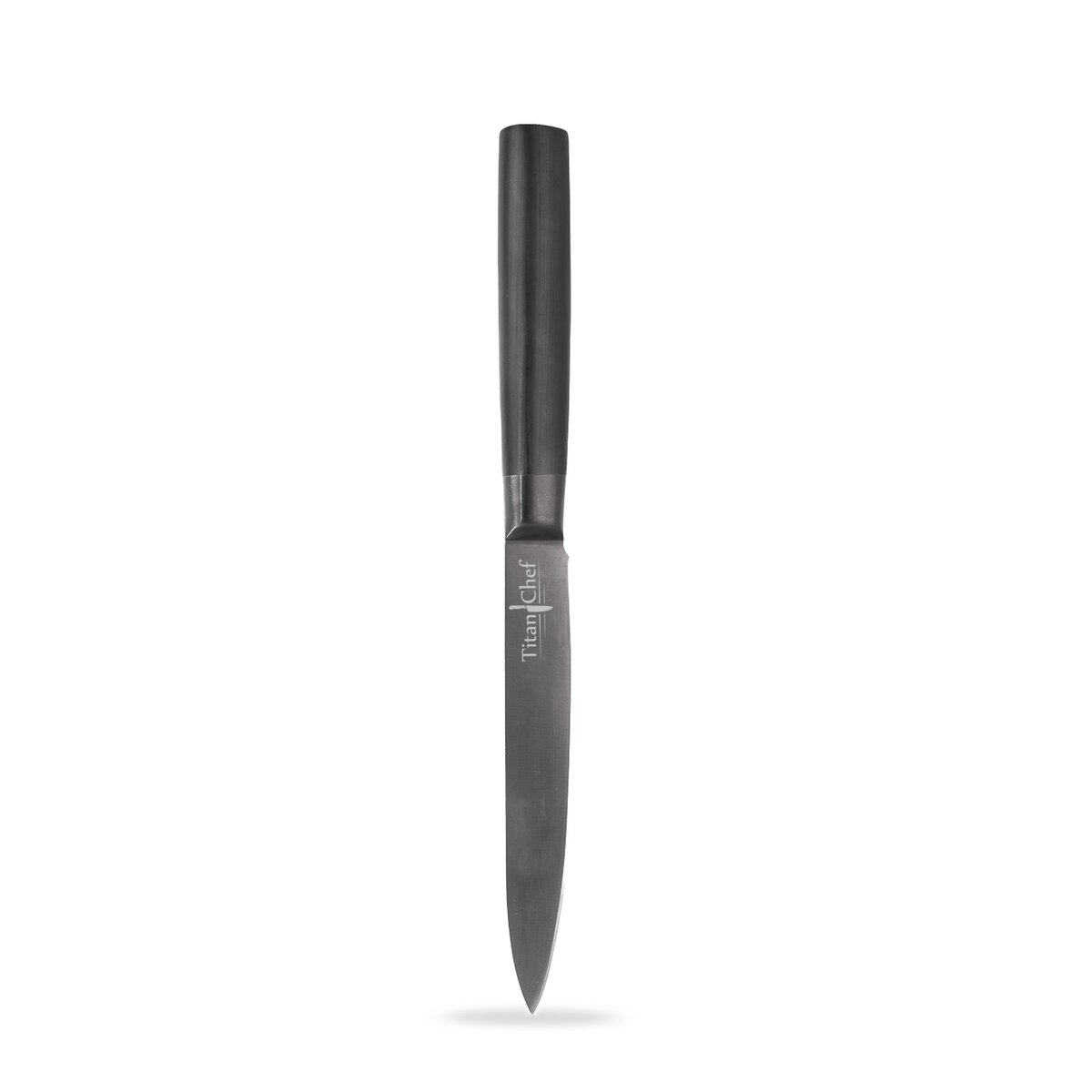Kód produktu 831141Kvalitný nerezový kuchynský nôž s tmavou titánovou vrstvou na 12,5 cm dlhej čepeli a vyváženou plastovou rukoväťou na presné krájanie bežných surovín v kuchyni.