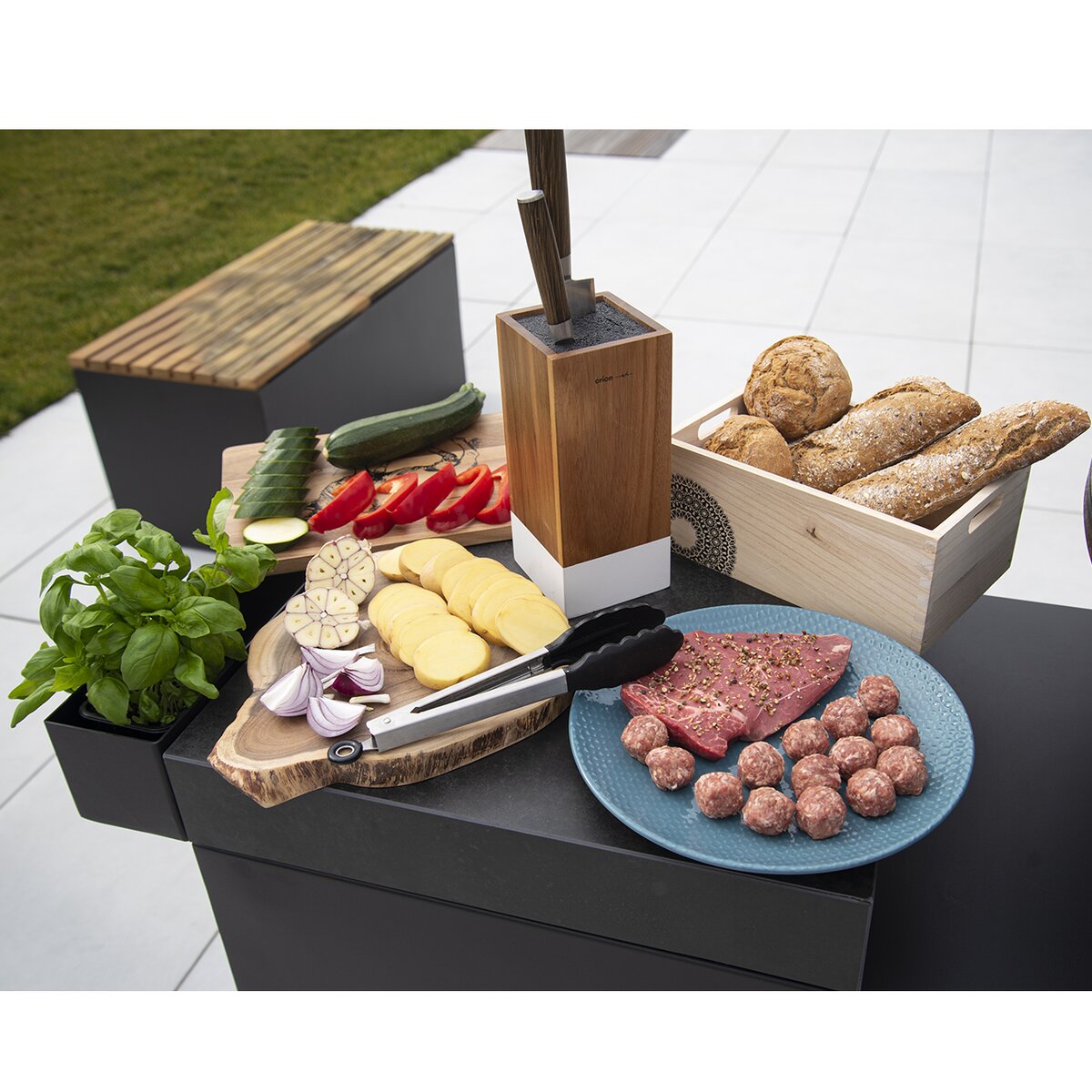 - široký nôž typu santoku v celkovej dĺžke 33,5 cm a s dĺžkou čepele 20,5 cm, možno využiť na drvenie strúčikov, porciovanie hydiny aj prenášanie nasekaných byliniek