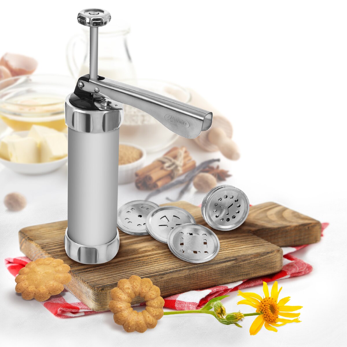 Kód produktu 141743Kovový mechanický lis na prípravu krehkých maslových sušienok. Jeho súčasťou je aj 20 ks nástavcov na rôzne tvary sušienok a 4 plastové zdobiace nástavce na zdobenie tort, dezertov i chlebíčkov.