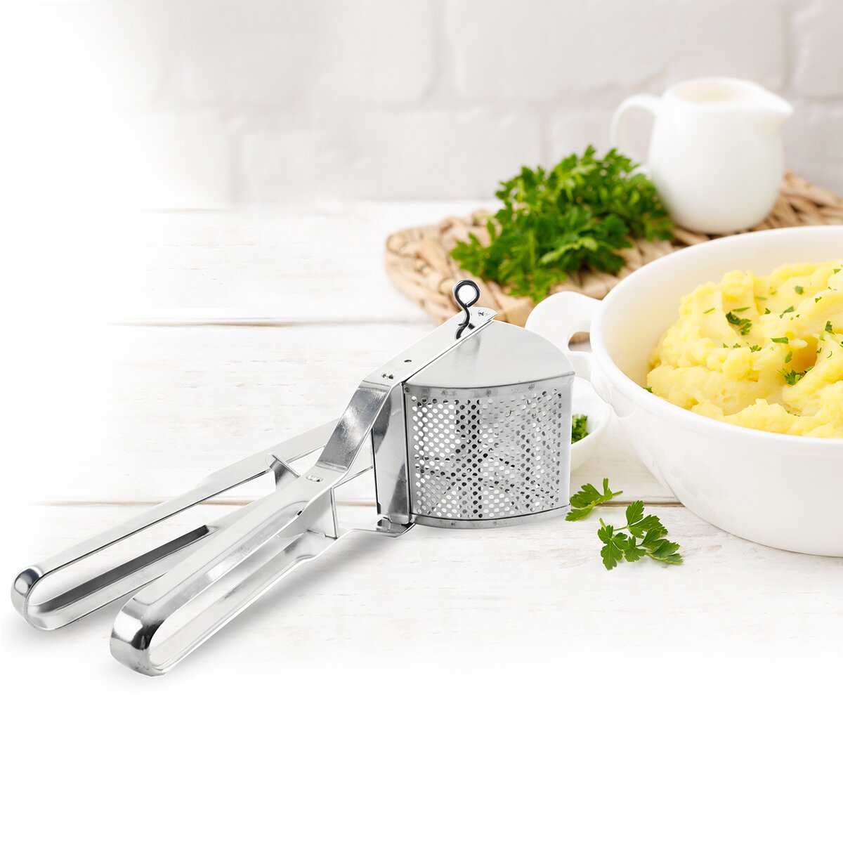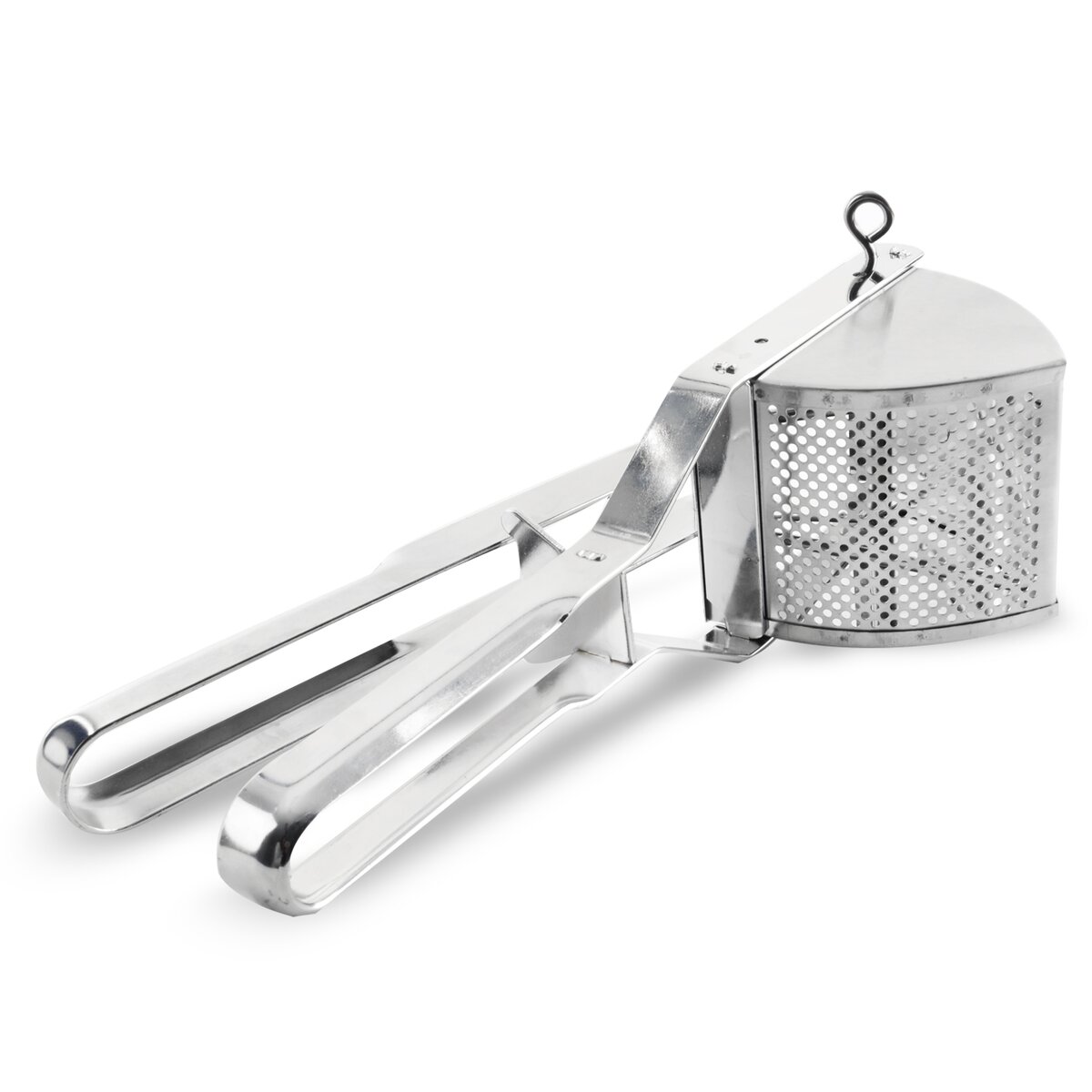 Ručný nerezový lis na zemiaky na lisovanie varených zemiakov pri príprave zemiakového cesta. Toto šikovné mačkadlo môžete využiť aj na pasírovanie varenej zeleniny na pyré alebo zrelých paradajok na pretlak. Priemer otvorov je 3 mm.