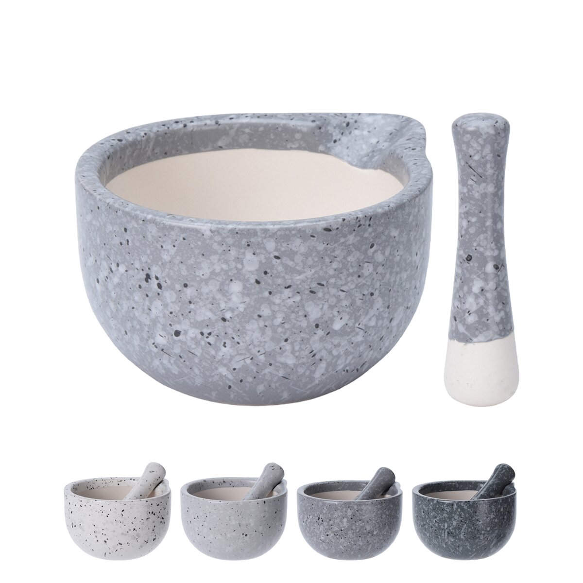 Kód produktu 131033Kameninový mažiar mramorového vzhľadu s priemerom 11 cm s tĺčikom, umožňujúci rýchle drvenie korenia, byliniek, semienok alebo prípravu pesta.
