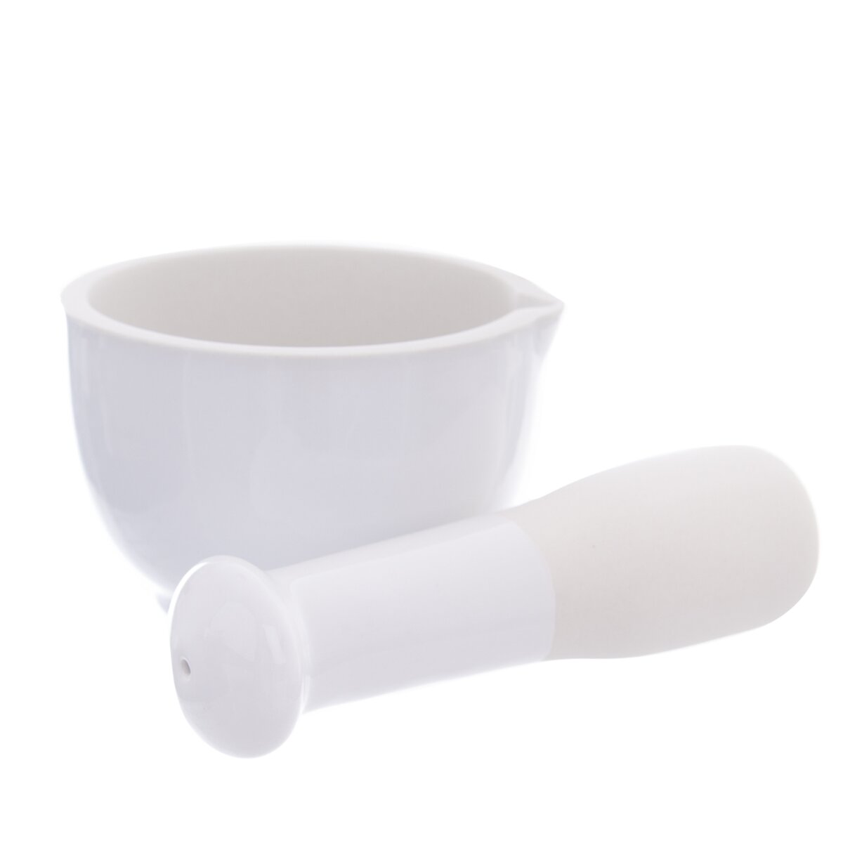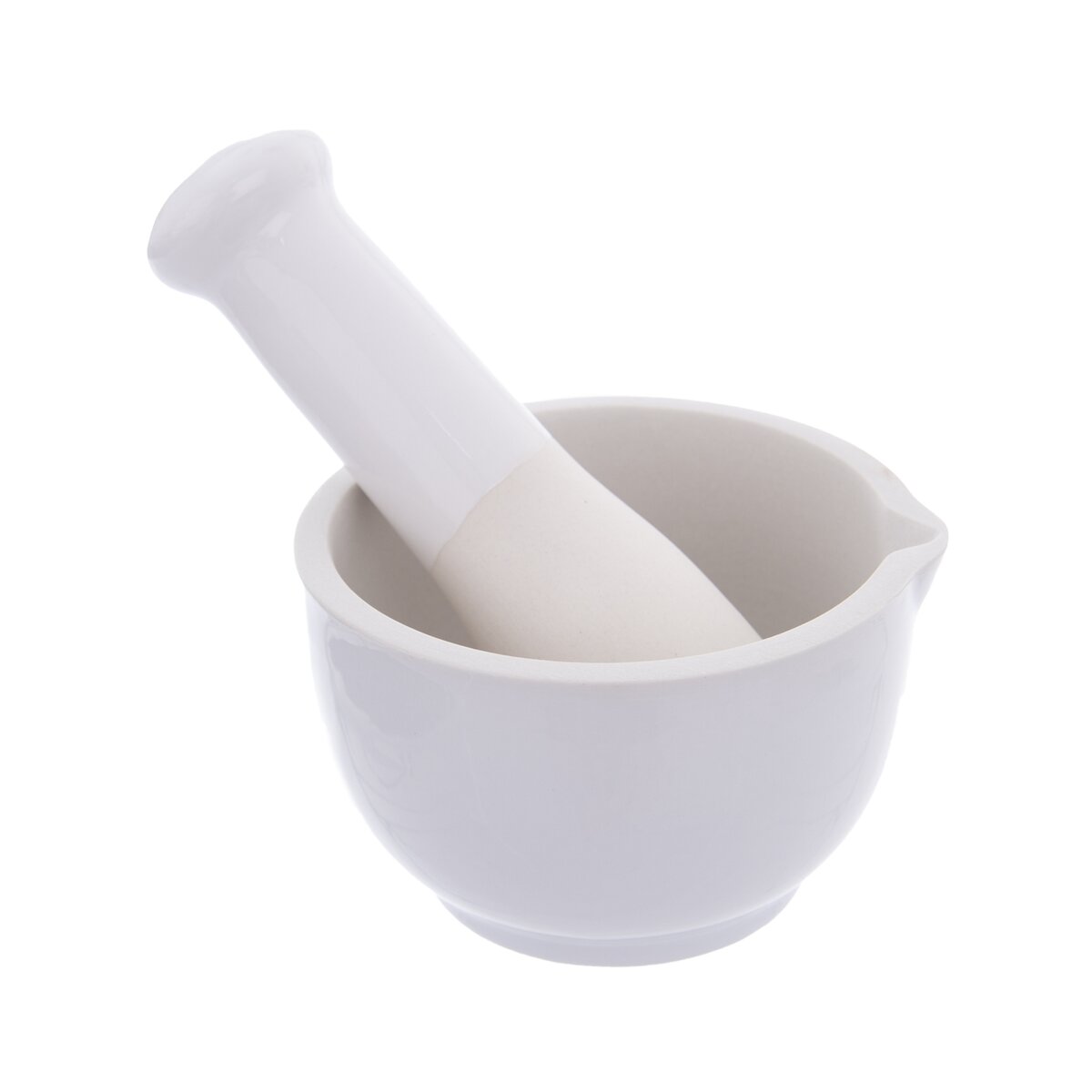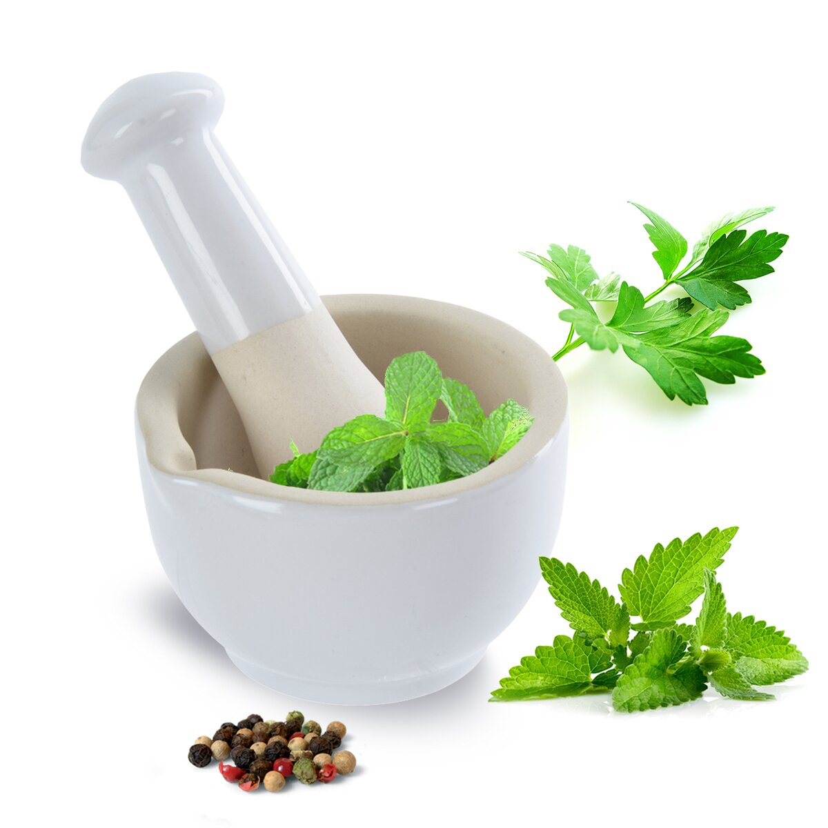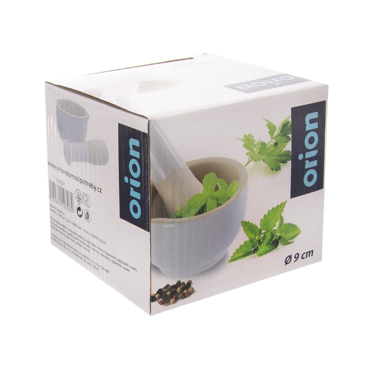 Kód produktu 131021Biely kameninový mažiar priemeru 9 cm s tĺčikom, umožňujúci rýchle drvenie korenia, byliniek alebo prípravu pesta.