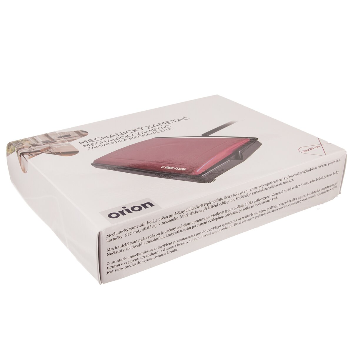 Mechanický zametač s palicou je určený na bežné upratovanie všetkých typov podláh. Dĺžka palice 93 cm. A ak ho chcete uložiť do komory alebo upratovacej miestnosti, môžete ho zavesiť za očko v rukoväti, pri prevážaní je možné palicu rozskrutkovať a rozdelenú na tri časti tak pohodlne preveziete. Kefa je vyrobená z plastu PP, časti okolo kief sú z PS, ďalšie plastové súčasti z ABS, PA a PVC.