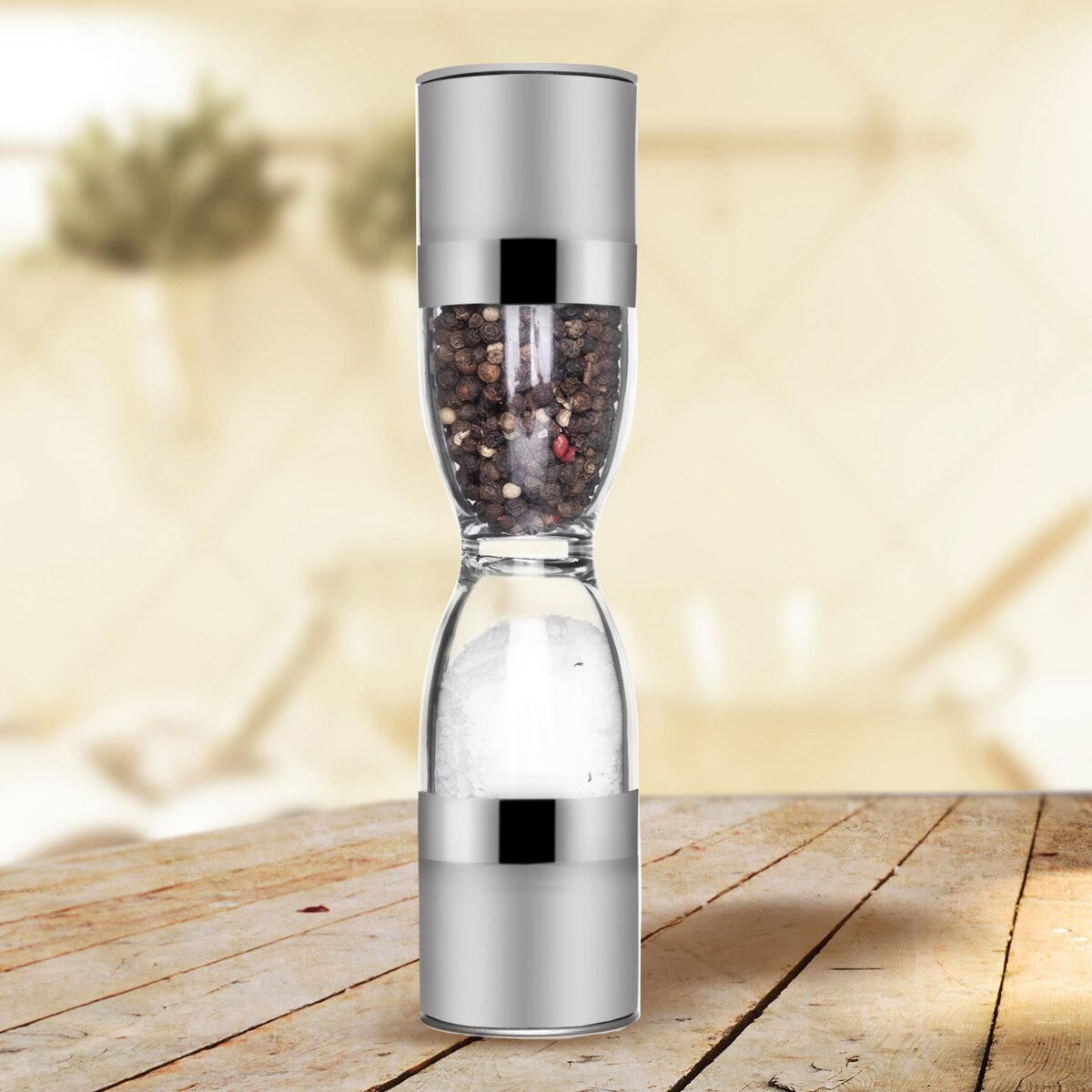Dvojitý nerezový mlynček na korenie alebo soľ s transparentnou plastovou časťou, ktorý ľahko čerstvo namelie korenie alebo pri dokončovaní pokrmov, ale dochutí aj hotové jedlá priamo pri stole.