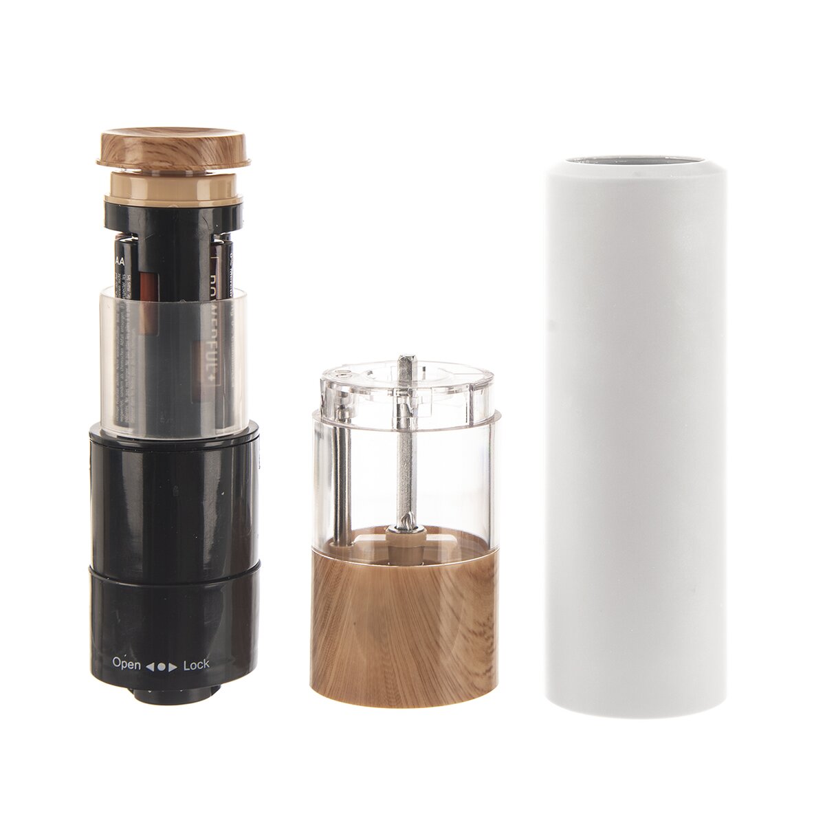 Nastavenie hrubosti mletia od jemného mletia korenia do polievok až po hrubo drvené korenie na steaky je umožnený pomocou otáčania matice v dolnej časti mlynčeka, a to v smere šípok. Napájanie na 4 ks 1,5 V AA batérií (nie sú súčasťou). Je vyrobený z plastu ABS a AS.