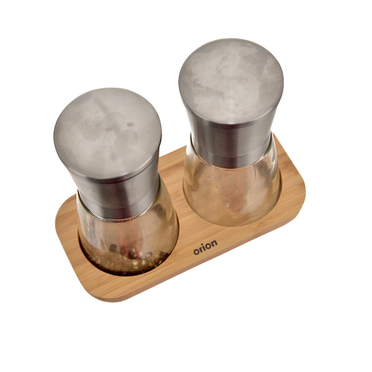 Kód produktu 130228Mechanické mlynčeky na korenie a soľ z nerezu a skla, opatrené keramickým mlecím mechanizmom, pre rýchle dochucovanie pokrmov pri varení aj pri servírovaní. Uložené na bambusovom podnose.