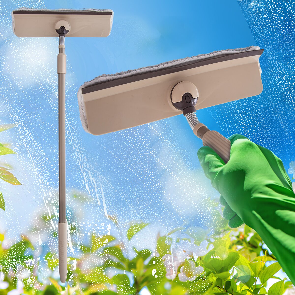 Pomocí namočeného mopu okno najprv umyte a stierkou rychle zotrite a usušte. Pružina zaisťuje přizpůsobení uhla mopu tak, aby bylo umývanie a stieranie okien, výkladov, sprchových kútov či zrkadiel dokonalé. Snímatelný návlek je na suchý zip a je možné ho prožít v práčke do teploty 40 °C.