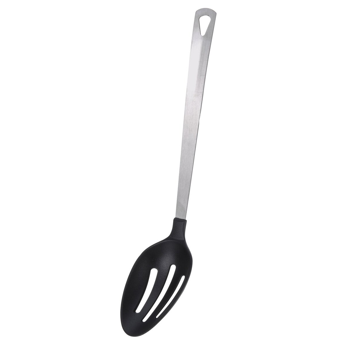 Naberačka lyžica dierkovaná. Možnosť zavesenia. Materiál: nylon – použitie do 210 °C, nerez. Vhodná do umývačky riadu. Rozmery: d. 33 cm, š. 6 cm.