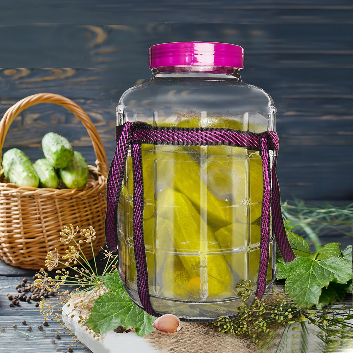 Sklenená dóza s plastovým vekom na závit a s dvoma uzávermi - jeden dózu pevne uzatvorí a dóza uchová a bezpečne prepraví tekutiny, druhý má otvor pre zaliatie žliabky vo veku vodou, aby tak zaistil proces kvasenia. Vďaka tomu v ňom môžete pripraviť kvasené uhorky, víno, kapustu. Nahradí klasické demižóny a hrnce na kvasenie. Materiál: sklo, plast. Je vybavený popruhom na pohodlné premiestňovanie. Rozmery: objem 18 l, pr. 27 cm, v. 39 cm.