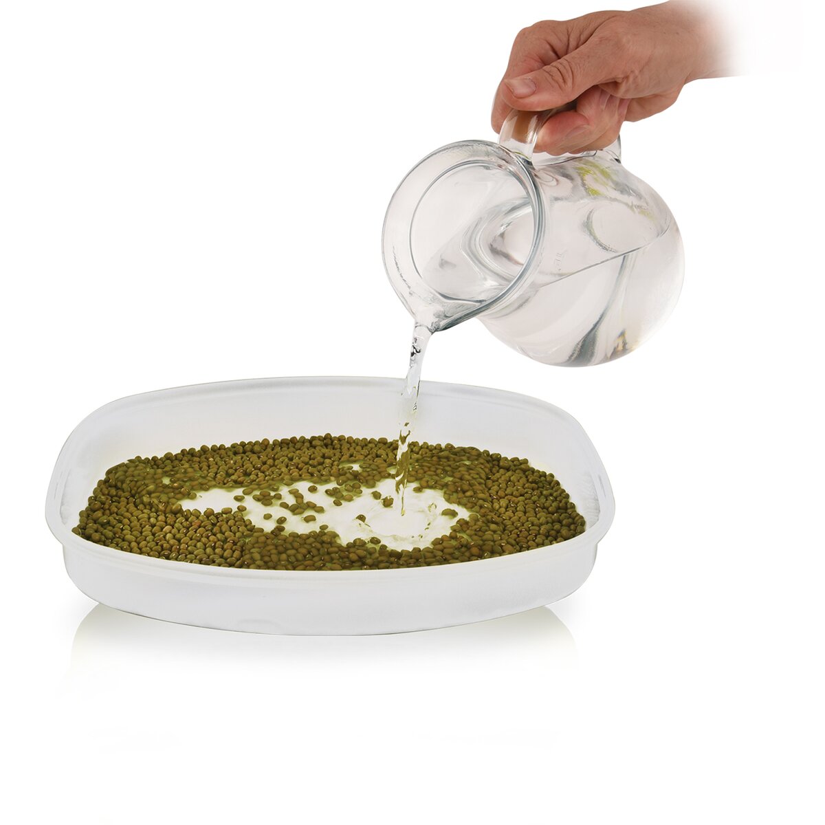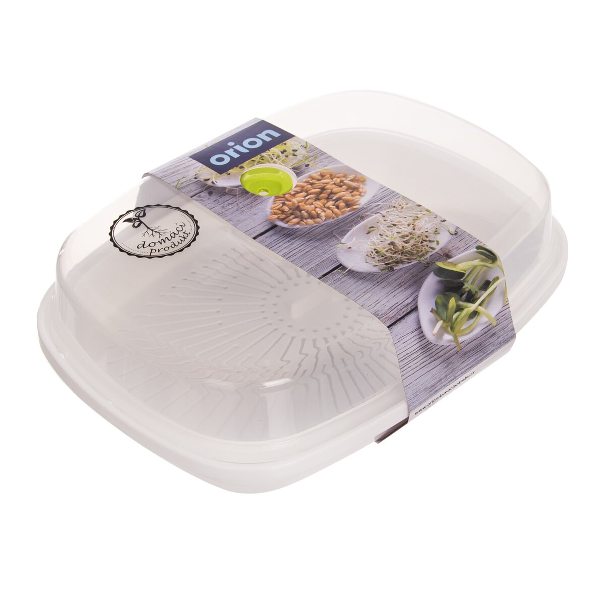 Návod, ako misku používať: Vybrané semienka namočíte na 24 hodín do vody. Po uplynutí tejto doby ich scedíte cez plastové sieťko, ktoré je súčasťou misky, a rovnomerne ich po ňom rozprestrite. Do misky pridajte trochu vody, sitko do nej znova položte a prikryte vekom s otvoreným horným otvorom. Potom nádobu umiestnite na teplé miesto, kam však nedopadá priame slnečné svetlo. Semená dvakrát denne preplachujte, samotné klíčky sa zberajú cca 5–8 deň, záleží však na danom druhu.- Materiál: plast