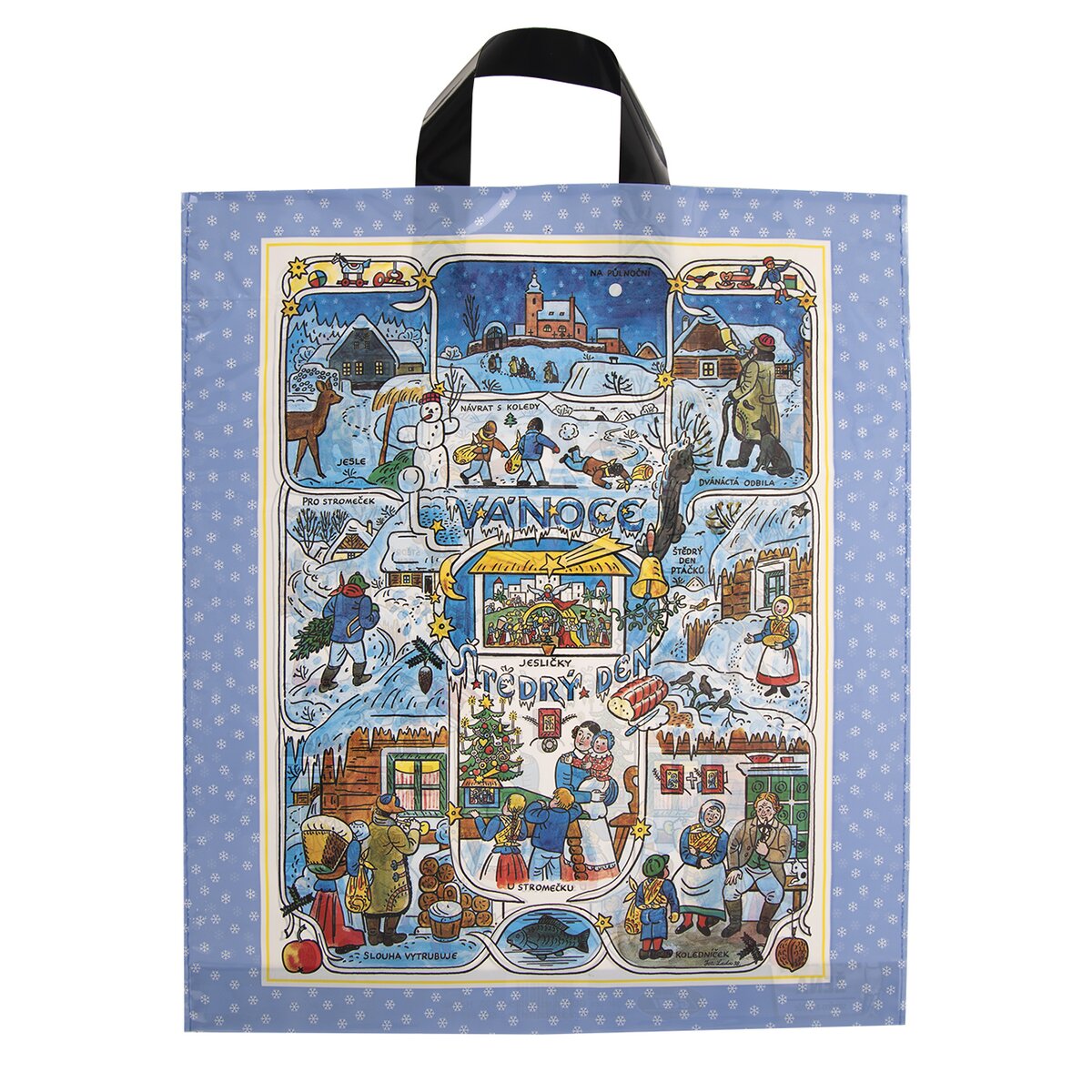 V čom odniesť nákup alebo odovzdať darčeky alebo suroviny na pečenie? Pekná igelitová taška s reprodukovanými zimnými motívmi klasika, českého ilustrátora a maliara Jozefa Lady, sa hodí nielen na opakované používanie pri nákupoch v obchodoch, ale pomôže previezť či doniesť zabalené darčeky, balíčky vašim blízkym.