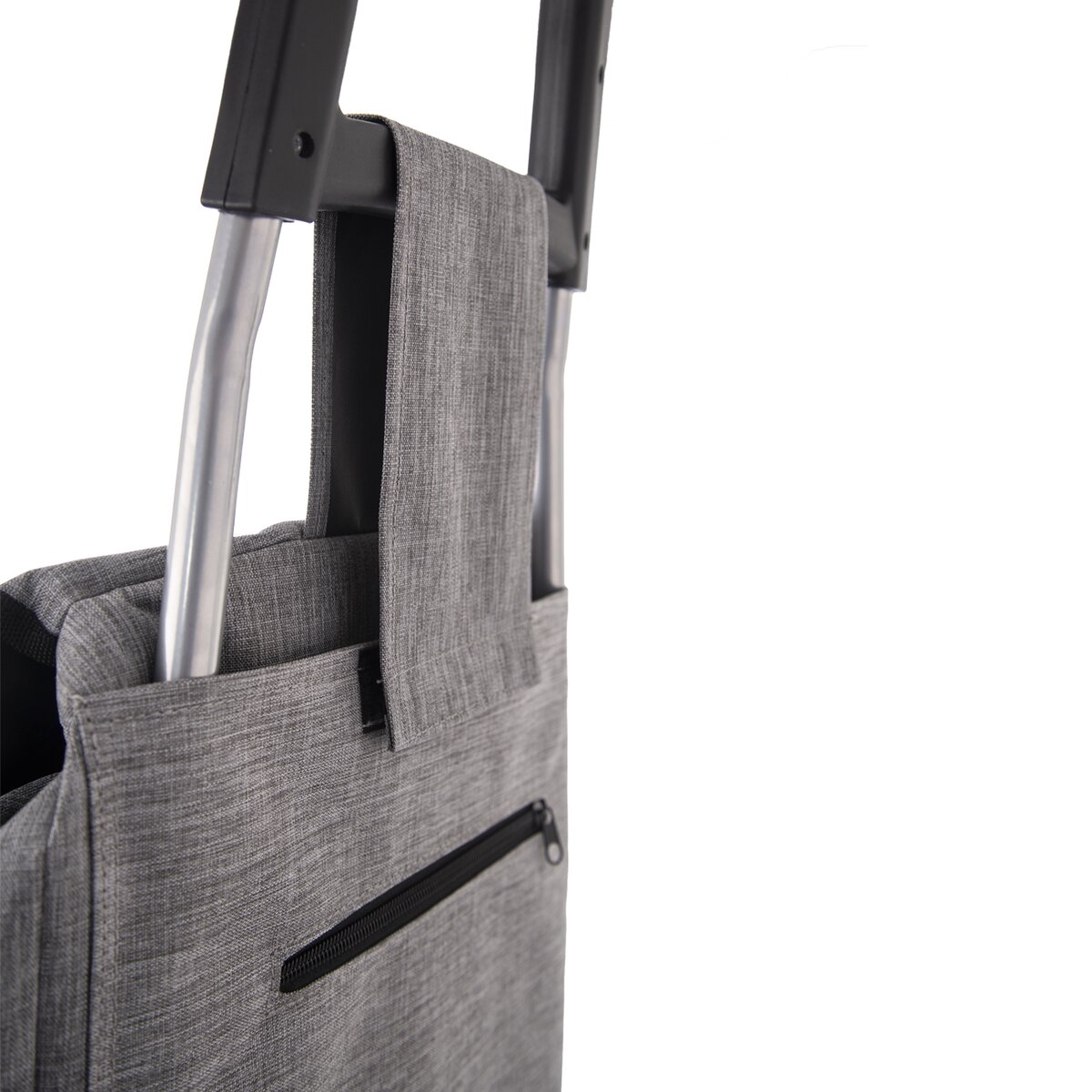 Kód produktu 731412Šedá nákupná taška na kolieskach s ľahkou kovovou konštrukciou, nosnosťou 30 kg a menším vreckom na zips.