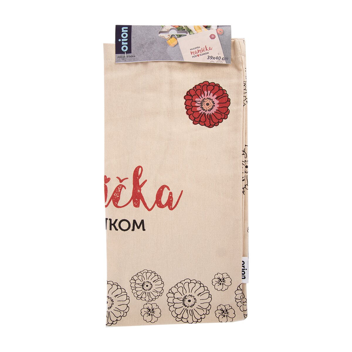 Kód produktu 731428Bavlnená nákupná taška s rozmermi 39×40 cm, s kvetinovým motívom a nápisom NAJLEPŠIA MAMIČKA POD SLNKOM.