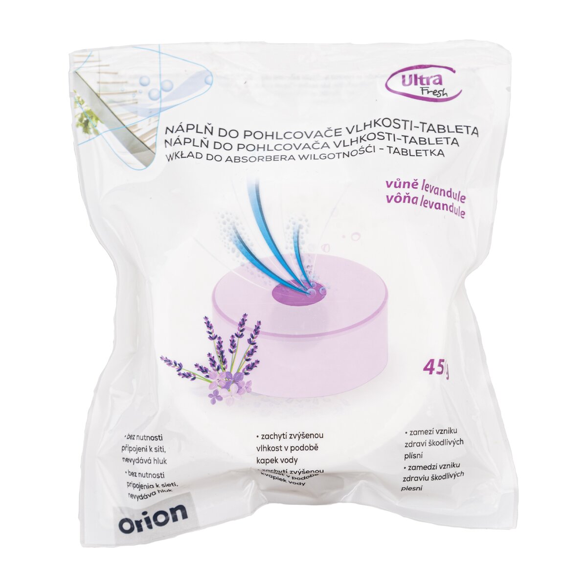 Kód produktu 832350Náplň do pohlcovača vlhkosti zo vzduchu vo forme tablety s vôňou levandule, s hmotnosťou 450 g a priemerom 10 cm.