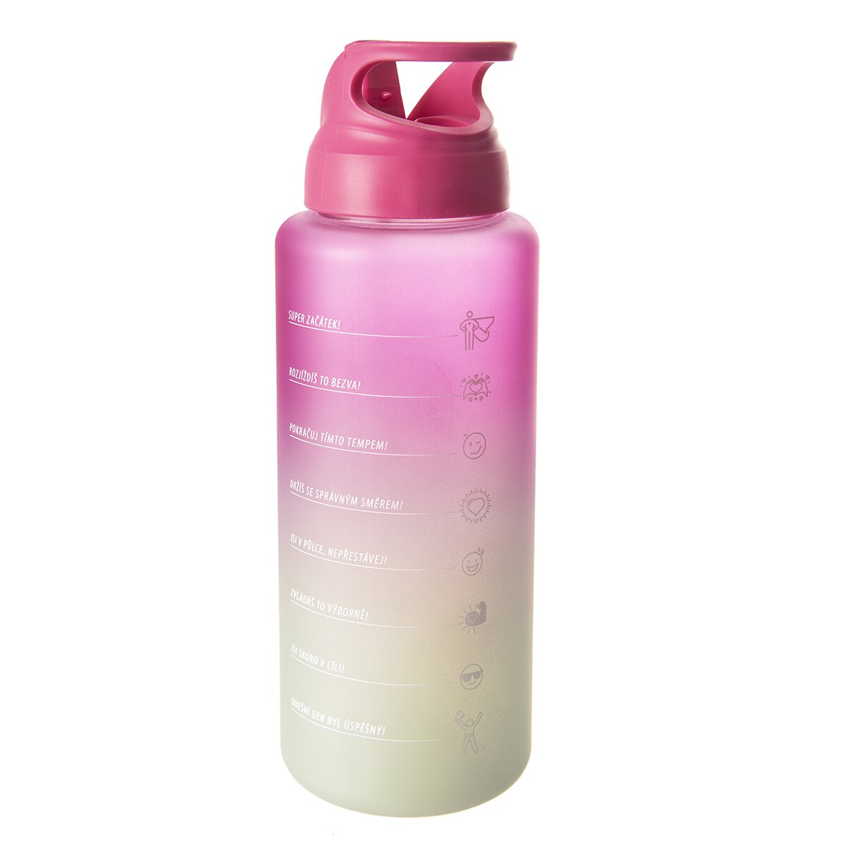 Viac informáciíAko si udržať dostatočný pitný režim doma, v práci alebo fyzickej aktivite? Stačí mať po ruke väčšiu fľašu, ktorá má moderný dizajn a navyše zo zadnej strany vtipnú stupnicu, ktorá udáva množstvo vypitých tekutín. Hodí sa na studené aj teplé nápoje. Pohodlné pitie zaistí výklopný náustok a vo vnútri vložená slamka.