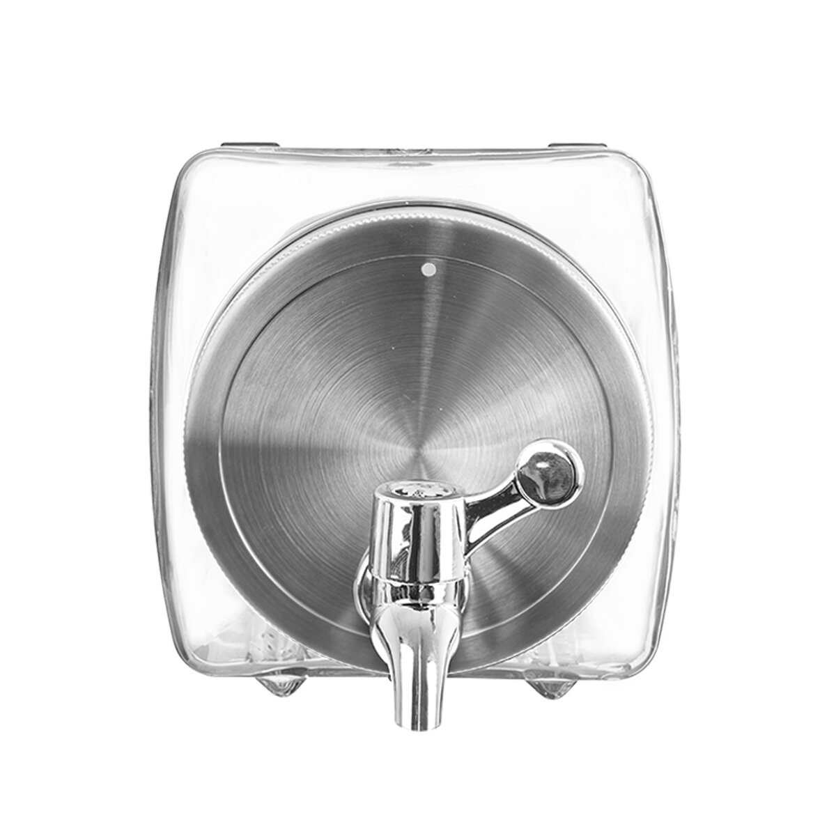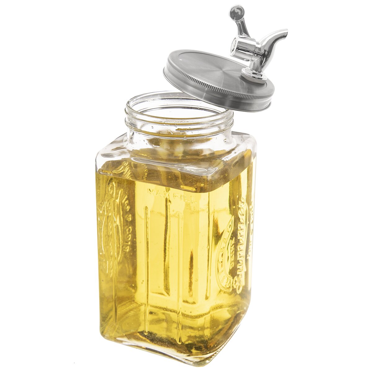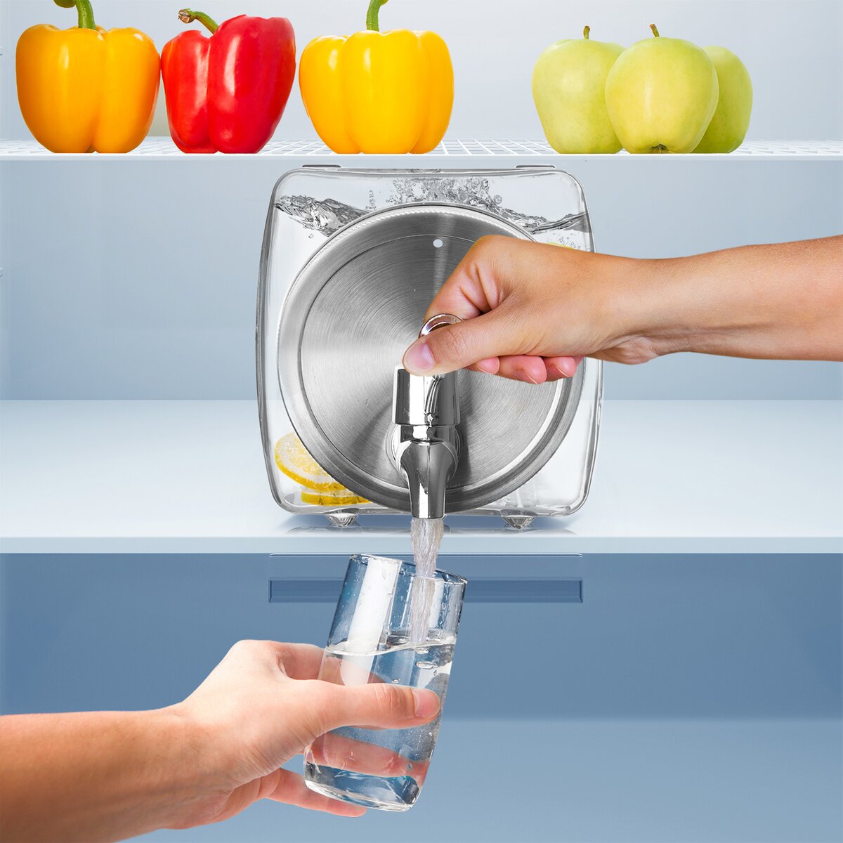 Fľaša s kohútikom na vypúšťanie tekutiny je vhodná na rôzne party bowle, ovocné šťavy, limonády. Tvarom je prispôsobená tak, aby bolo možné ju umiestniť do chladničky. Horný otvor je dôležitý pre prísun vzduchu pri vypúšťaní. Široký plniaci otvor pre ľahké vkladanie a vyberanie ovocia i pre umývanie, kovové viečko na závit. Materiál: sklo, kov, plast, silikónové tesnenie. Zásobník nie je vhodný pre horúce tekutiny. Rozmery: objem max. plnenia 2,8 l, objem celkový 3,4 l, 13x32x14 cm.