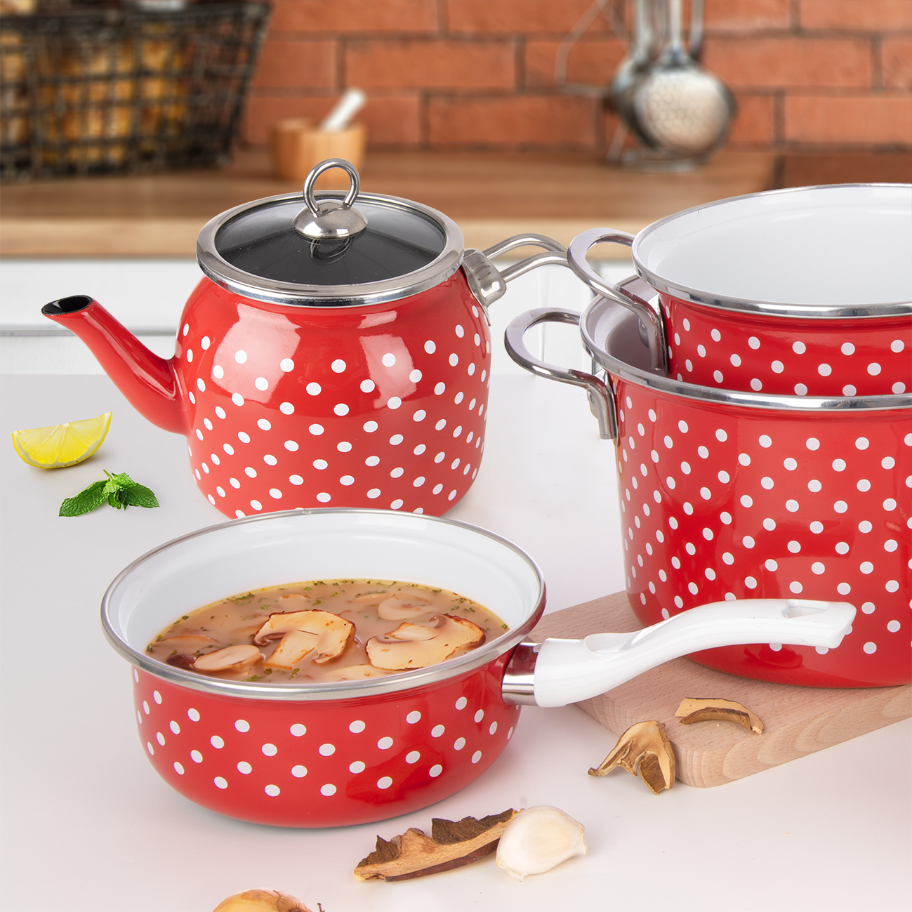 Okrem smaltovaného riadu, kde nájdete hrnce, kastróly, hrnčeky, čajníky aj misy na miesenie z kolekcie BODKA, môžete domácnosť doplniť aj veselým textilom alebo porcelánovým riadom. Takže kto miluje retro a štýlové varenie s nádychom nostalgie, pre toho je táto kolekcia ako stvorená.