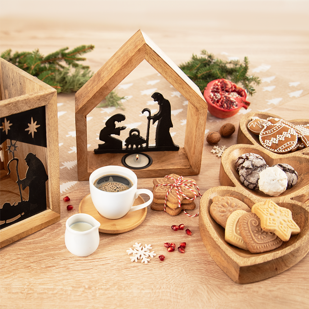 Nič nevytvára útulnú vianočnú atmosféru lepšie ako prírodné materiály. Doplnky z mangového dreva, ako sú svietniky, lucerny, servírovacie tácky alebo misy, dodajú vášmu interiéru elegantný rustikálny vzhľad.