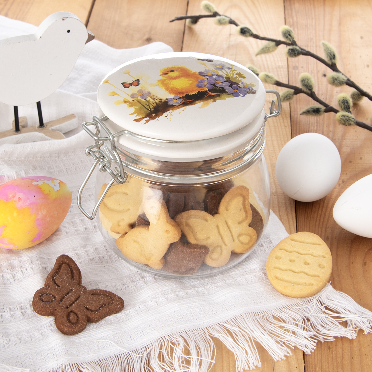 V ponuke nájdete aj sklenené dózy s keramickým viečkom a kovovým klipovým zatváraním. Do nich je možné vložiť krehké sušienky, čokoládové vajíčka pre koledníkov, ale aj domácu paštétu alebo tvarohovú nátierku s pažítkou.
