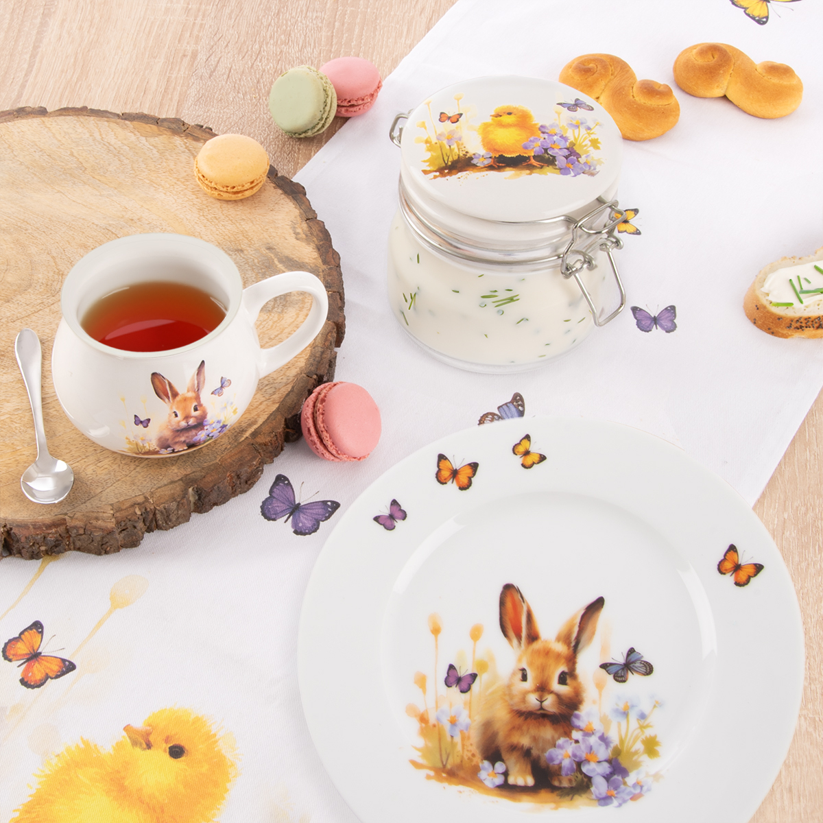 Pokiaľ hľadáte inšpiráciu pre jarné stolovanie, môžete zvoliť dezertné taniere s nežným motívom zajačika a poletujúcich motýlikov. Hrnčeky s jarnou potlačou dokonale doplnia pohodovú atmosféru pri raňajkách alebo popoludňajšom čaji.