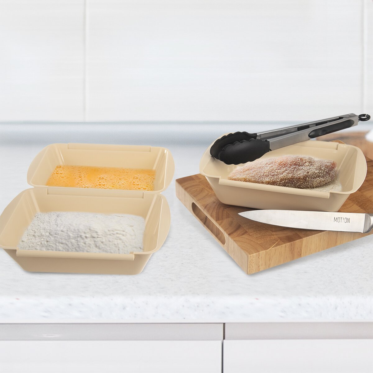 Kód produktu 128372Súprava troch plastových misiek určených na obaľovanie rezňov v trojobale. Každá miska má rozmery 26×20×5,5 cm.