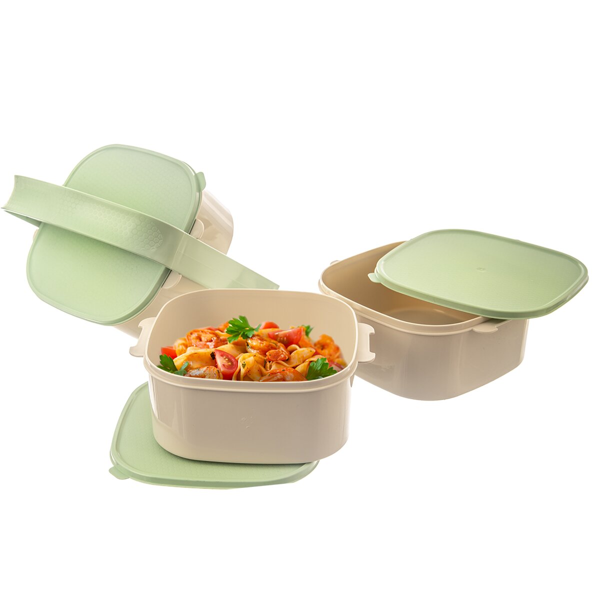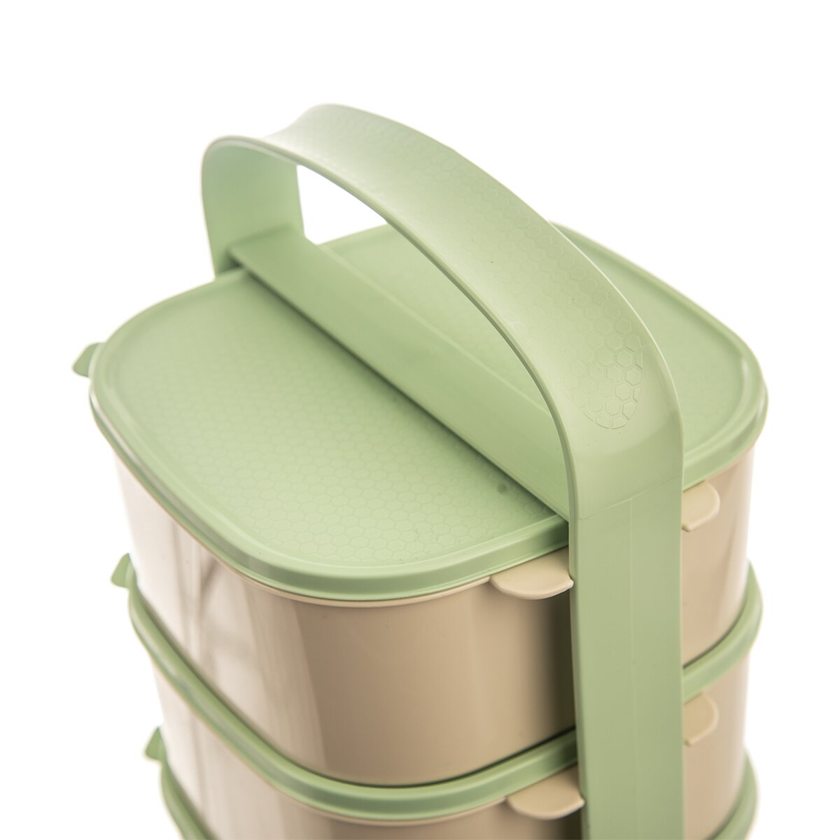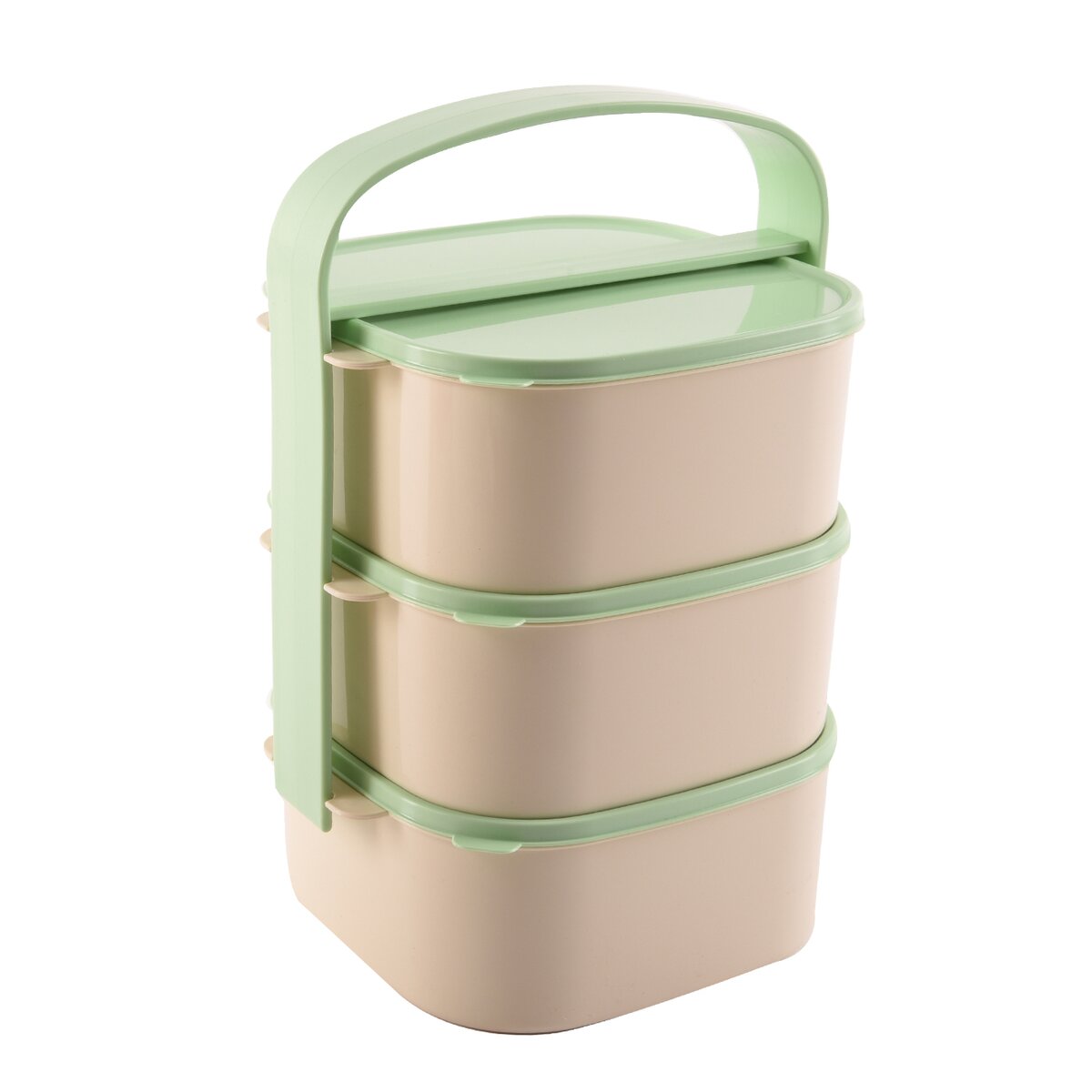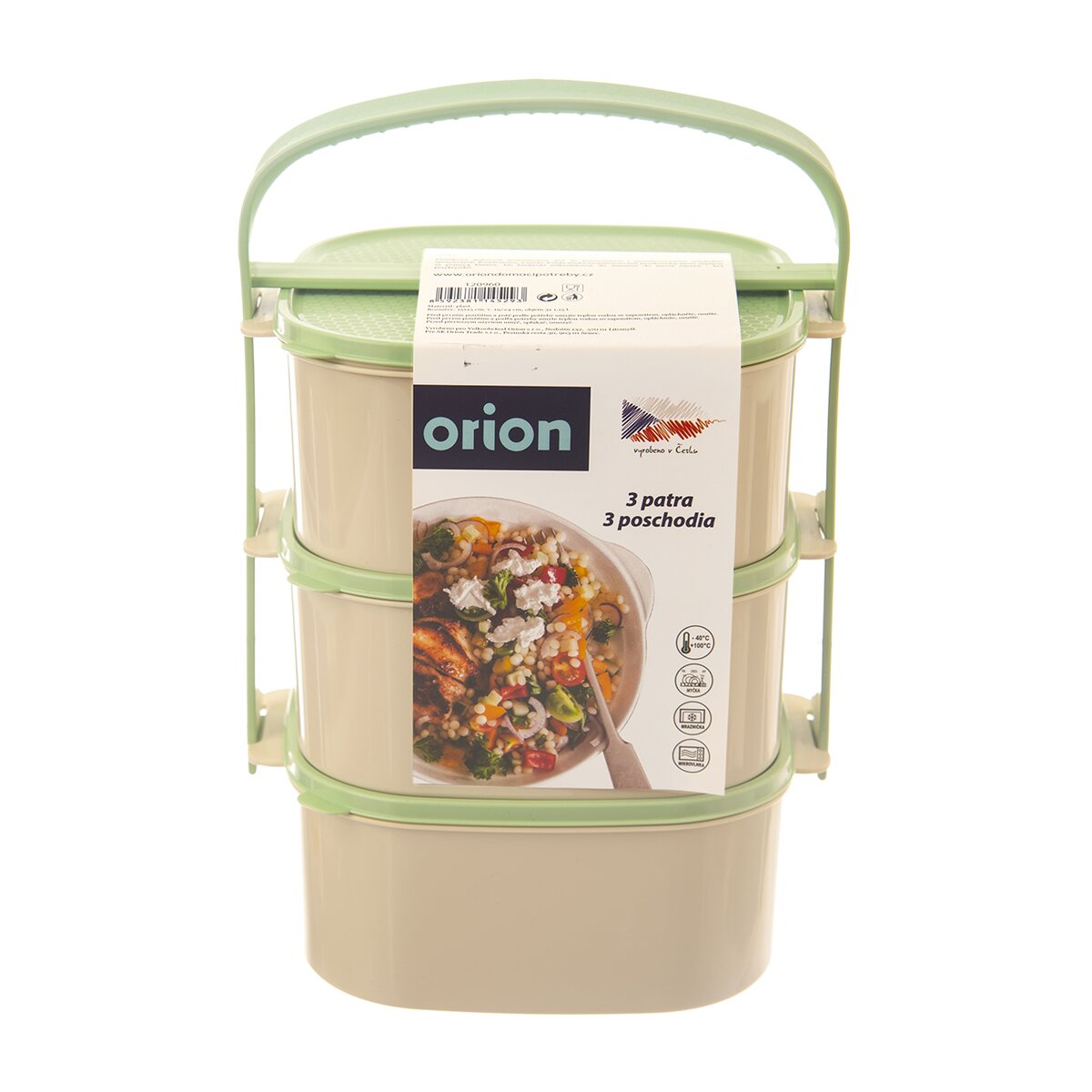 Kód produktu 120960Zelenobéžový trojposchodový obedár ALMI s objemom 3×1,15 l. Obsahuje 3 hranaté misky z kvalitného plastu, z ktorých je každá vybavená vlastným viečkom.