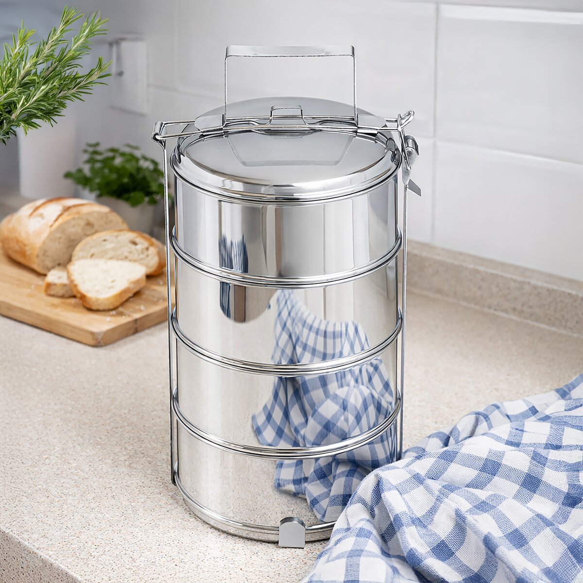 Kód produktu 120965Nerezový štvorposchodový obedár v rovnom prevedení, súčasťou ktorého sú 4 misky s objemom 1,3 l, samostatné viečka misiek, vrchná pokrievka a kovový stojan s prackou a uchom, ktorý zostavu spojí a umožní jeho prenášanie.