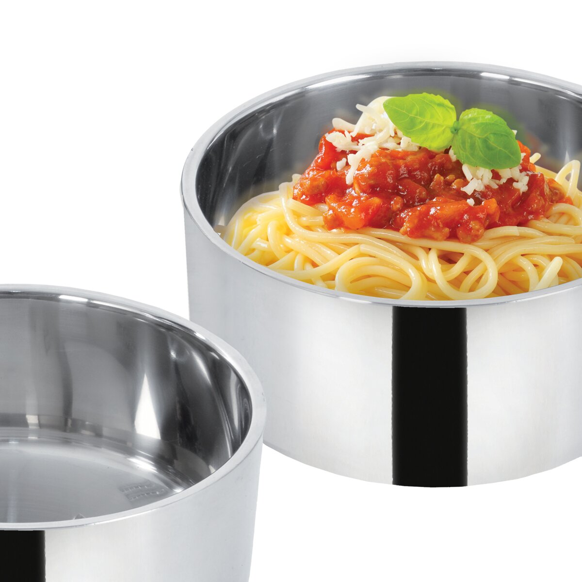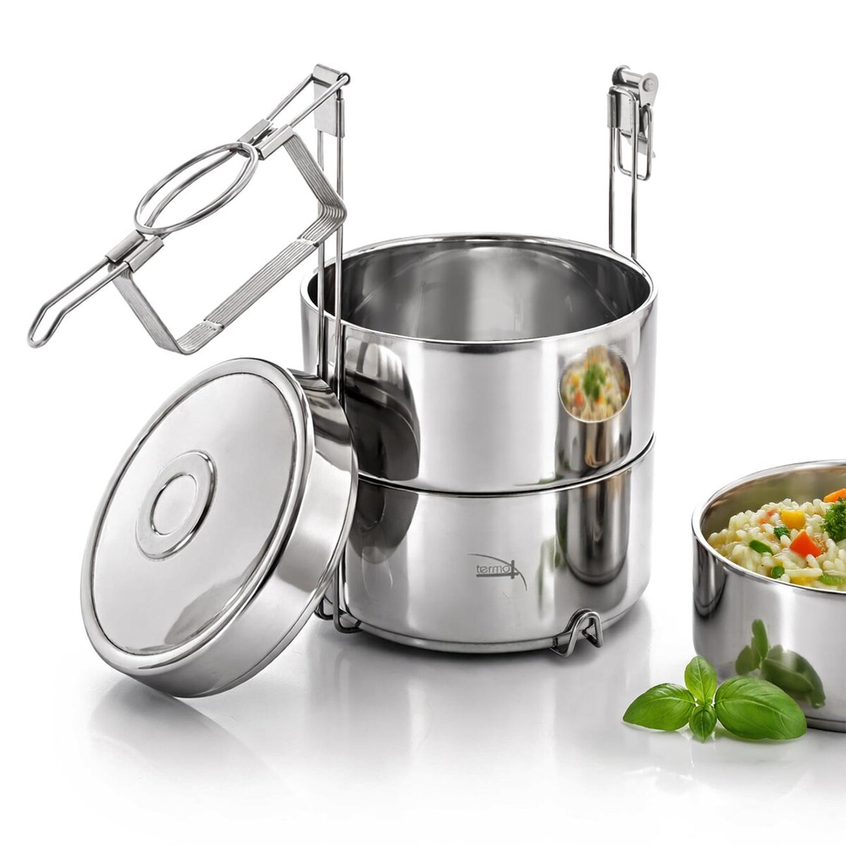 Obsahuje 3 nerezové dvojstenné misky s objemom 0,9 l. Misky sú ideálne na uloženie celého menu, polievky, hlavného jedla a dezertu. Jeho súčasťou je tiež kovový stojan, ktorý umožňuje skladanie nádob na seba a zároveň je opatrený prackou slúžiacou na ich pevné zaistenie.