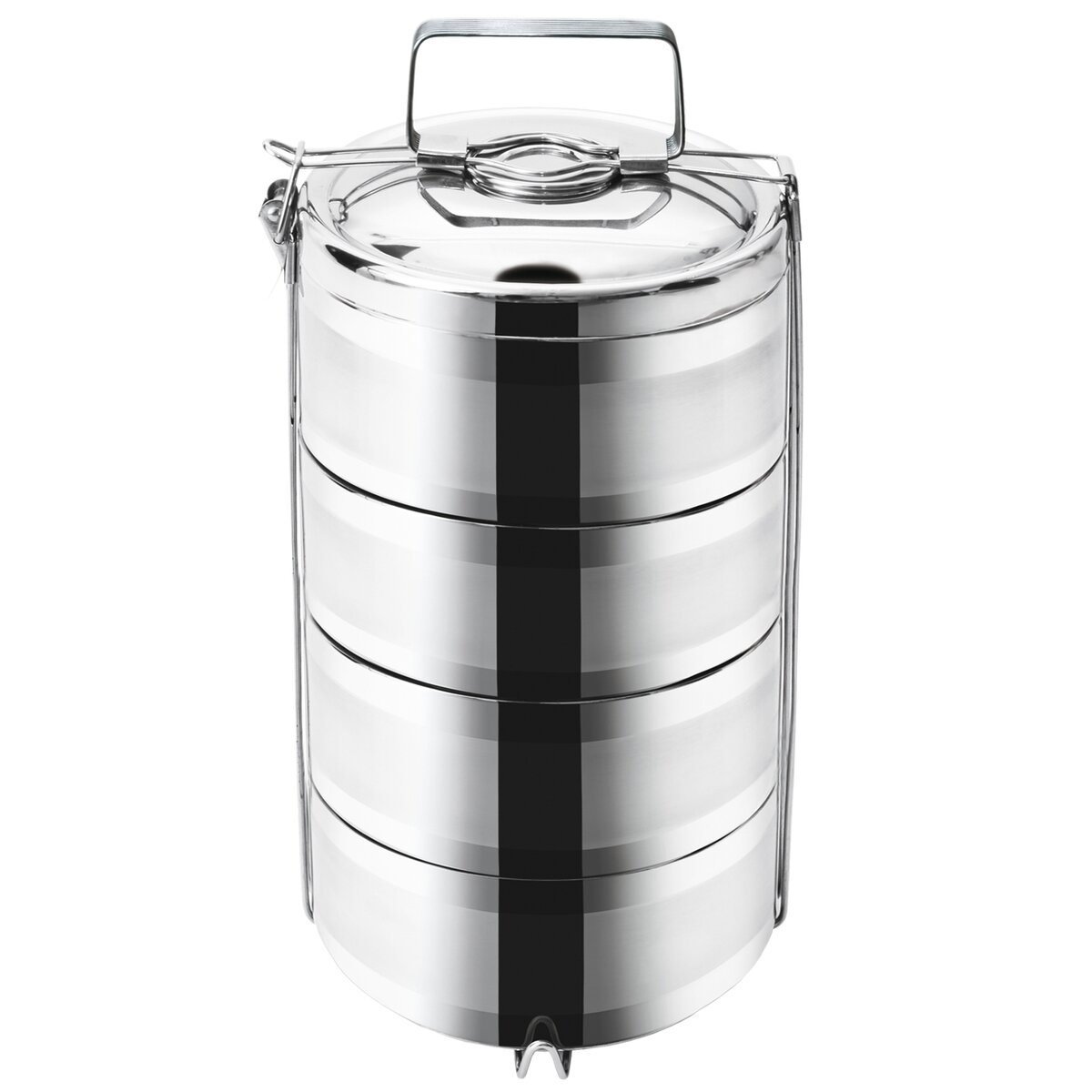 Kód produktu 120959Nerezový štvorposchodový obedár v rovnom prevedení, súčasťou ktorého sú 4 dvojstenné misky s priemerom 16 cm, vrchná pokrievka a kovový stojan s prackou a uchom, ktorý zostavu spojí a umožní jeho prenášanie.