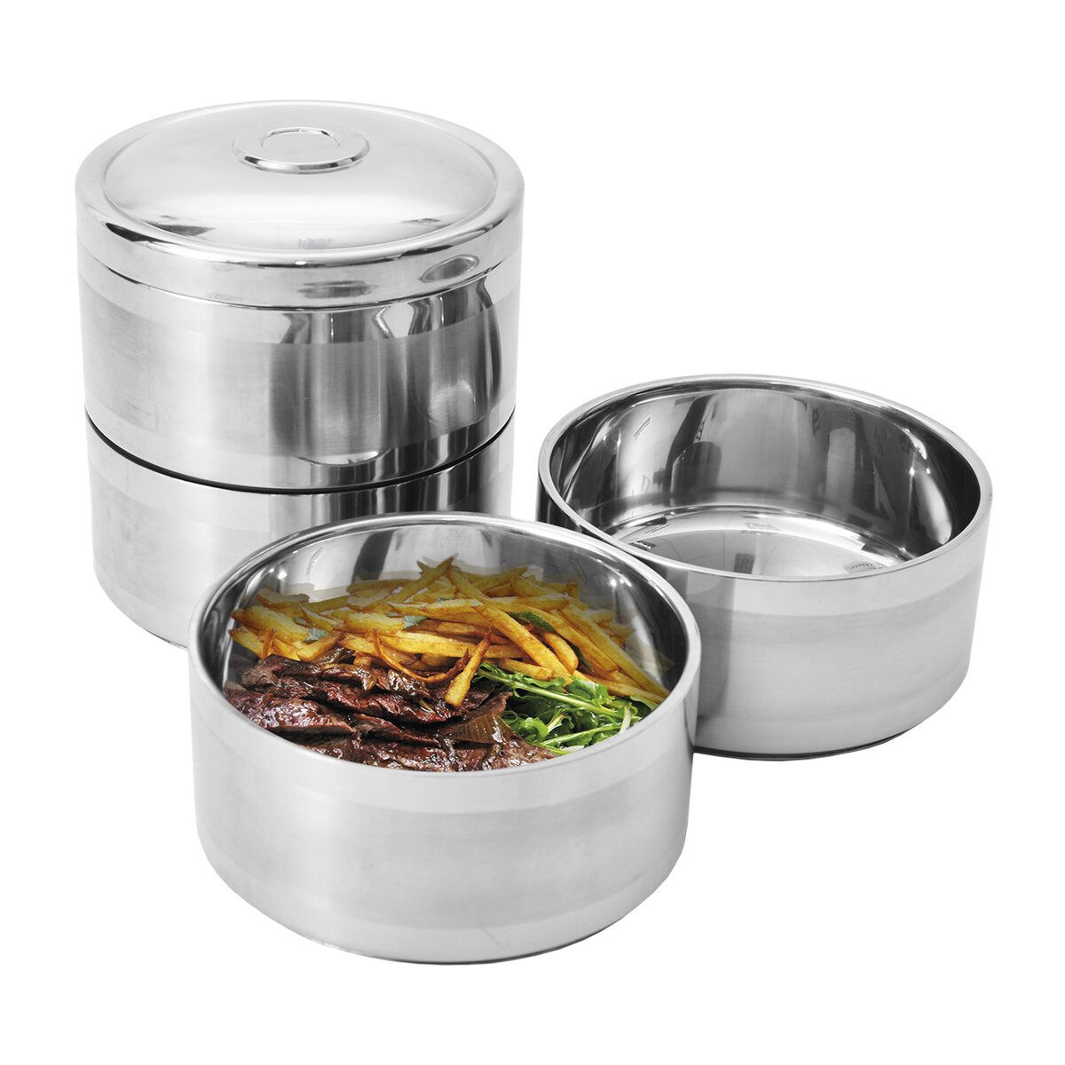 Obsahuje 4 nerezové dvojstenné misky s objemom 1,1 l. Misky sú ideálne na uloženie celého menu, polievky, hlavného jedla, samostatnej prílohy a dezertu. Jeho súčasťou je tiež kovový stojan, ktorý umožňuje skladanie nádob na seba a zároveň je opatrený prackou slúžiacou na ich pevné zaistenie.