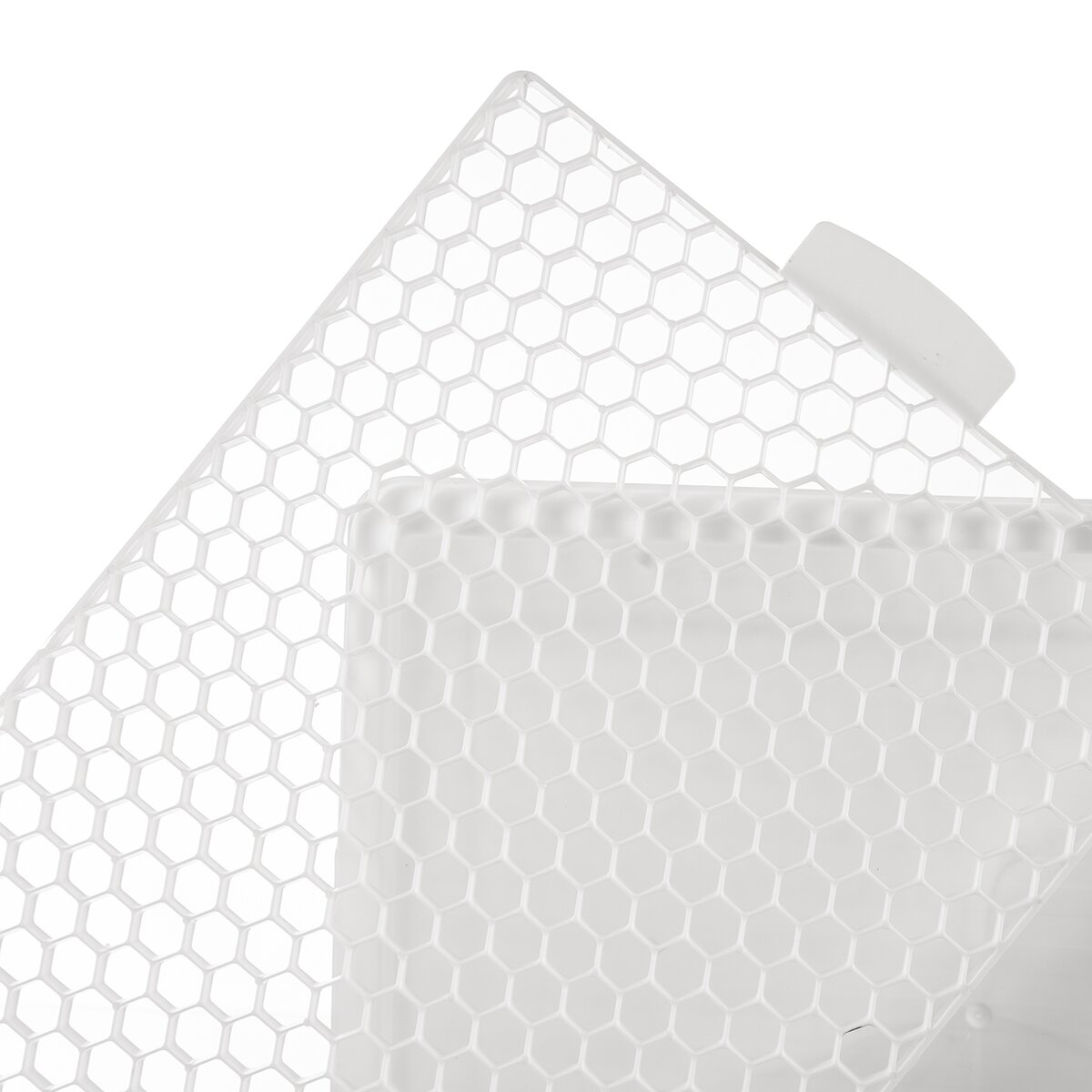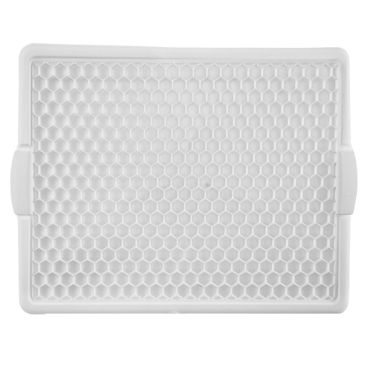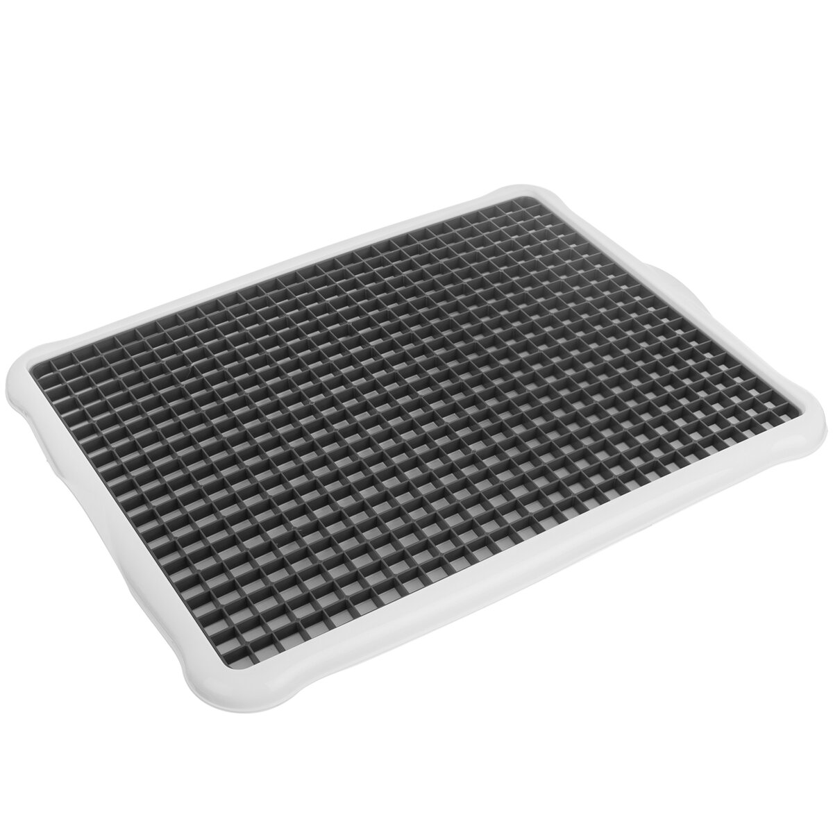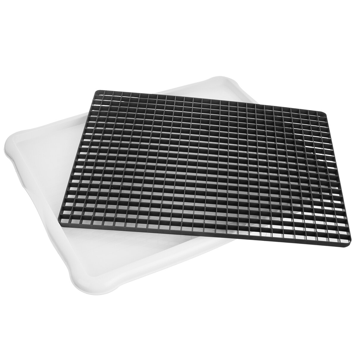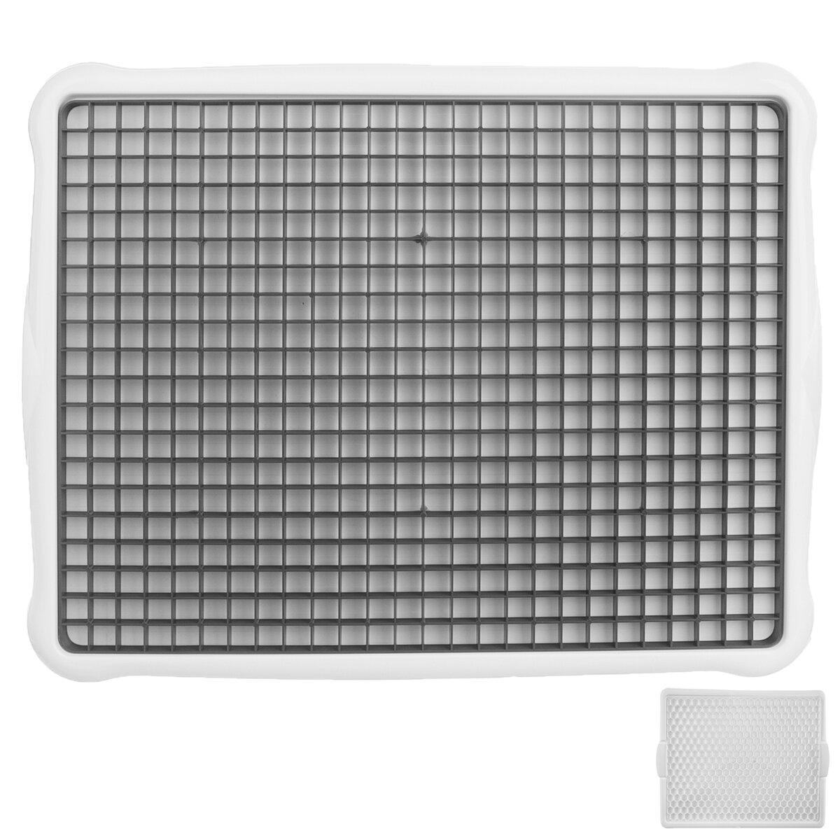Kód produktu 150693Biela odkvapkávacia podložka na riad s rozmermi 42,3×33,2×1,6 cm s čiernou plastovou mriežkou.