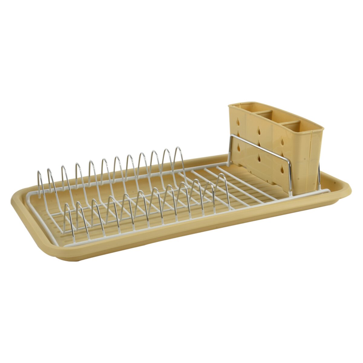Kód produktu 150681Béžový plastový odkvapkávač na riad s drôtenou konštrukciou, s rozmermi 43×23×12 cm.