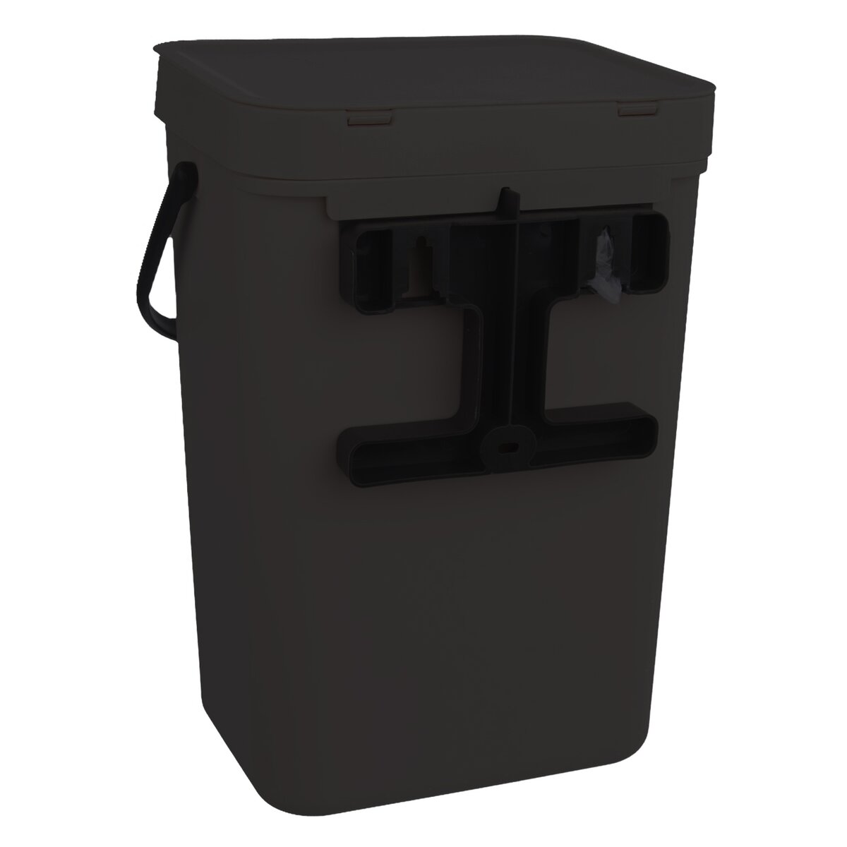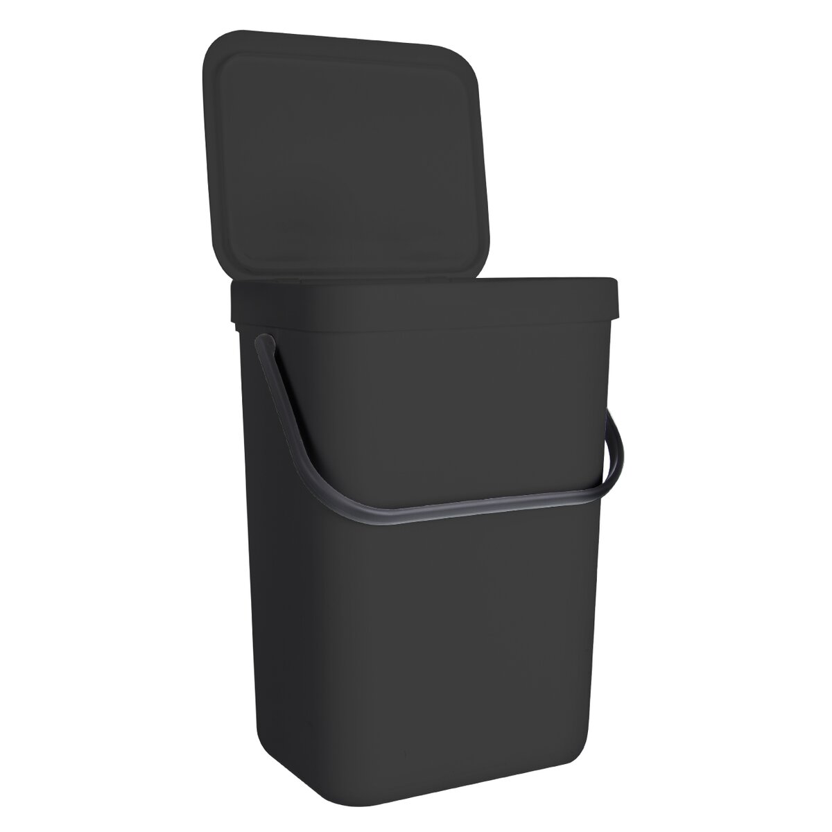 Kód produktu 731347Čierny plastový kôš na odpadky s objemom 10 l s odklápacím vekom a odnímateľným rámom pre upevnenie vrecka.