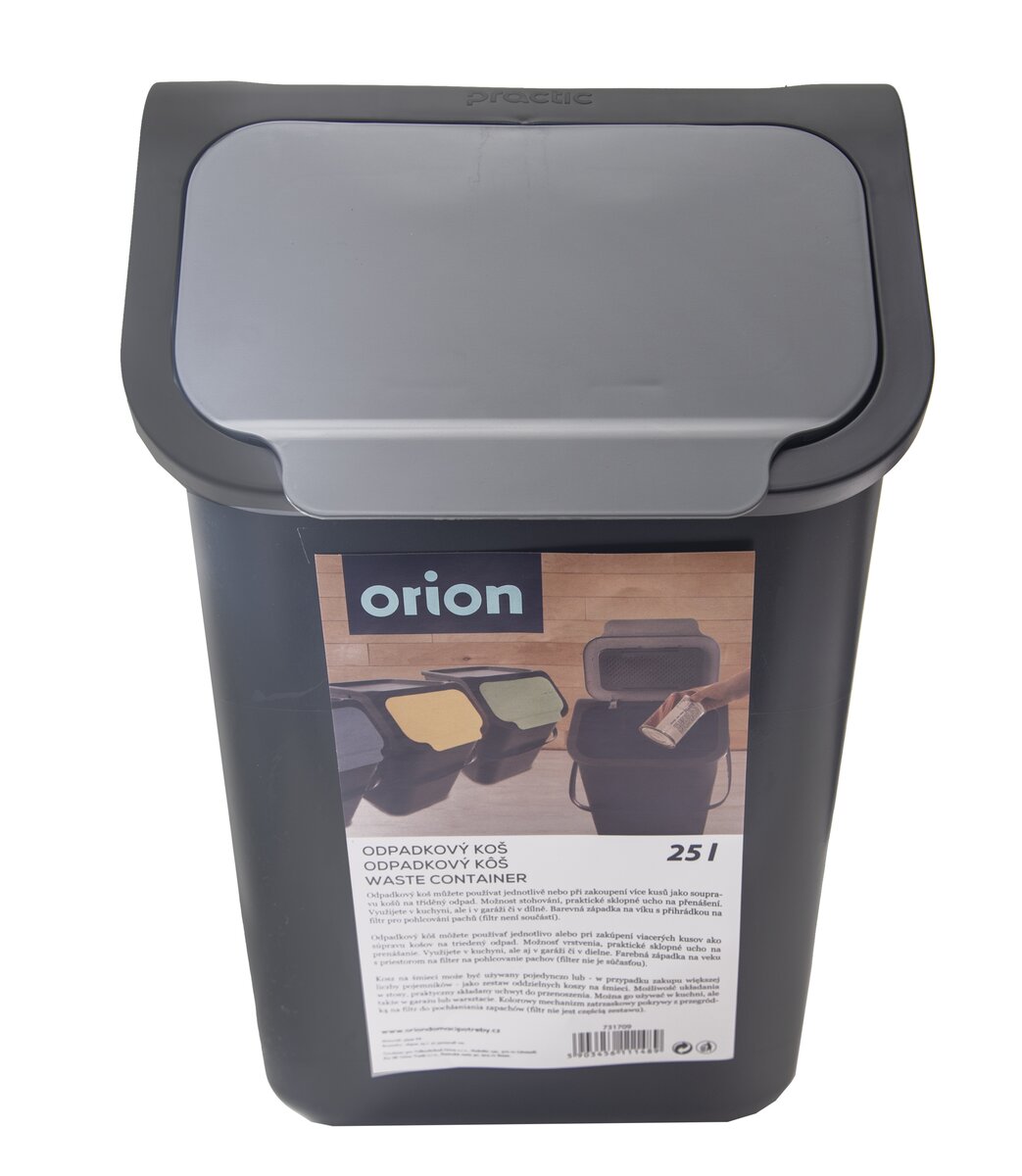 Kód produktu 731709Plastový kôš na odpadky s objemom 25 l, s držadlom, vekom a šedou výklopnou časťou, vhodný na bežný aj triedený odpad.