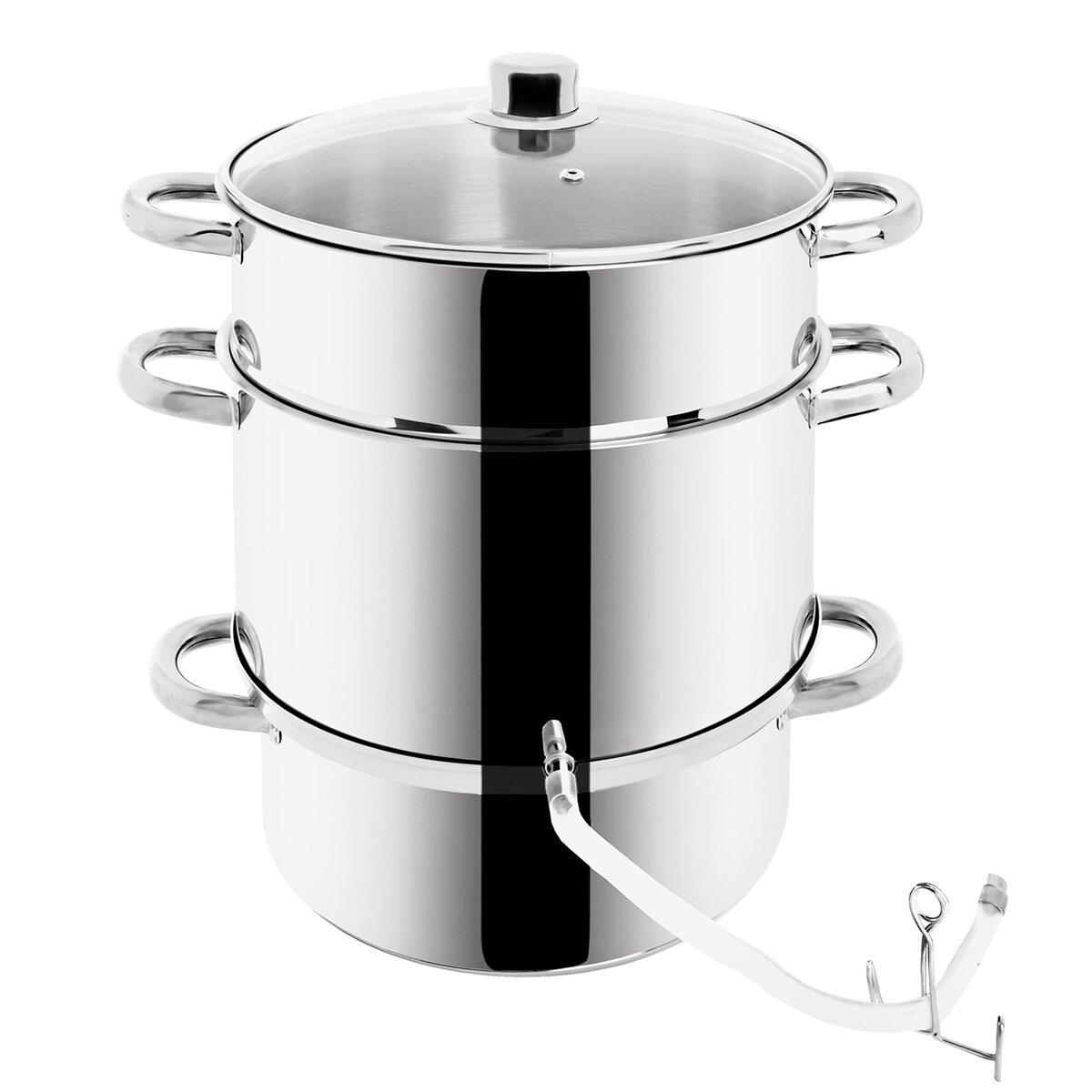 Kód produktu 131421Nerezový odšťavovací hrniec s tromi poschodiami, so sklenenou pokrievkou a vypúšťacou hadičkou.