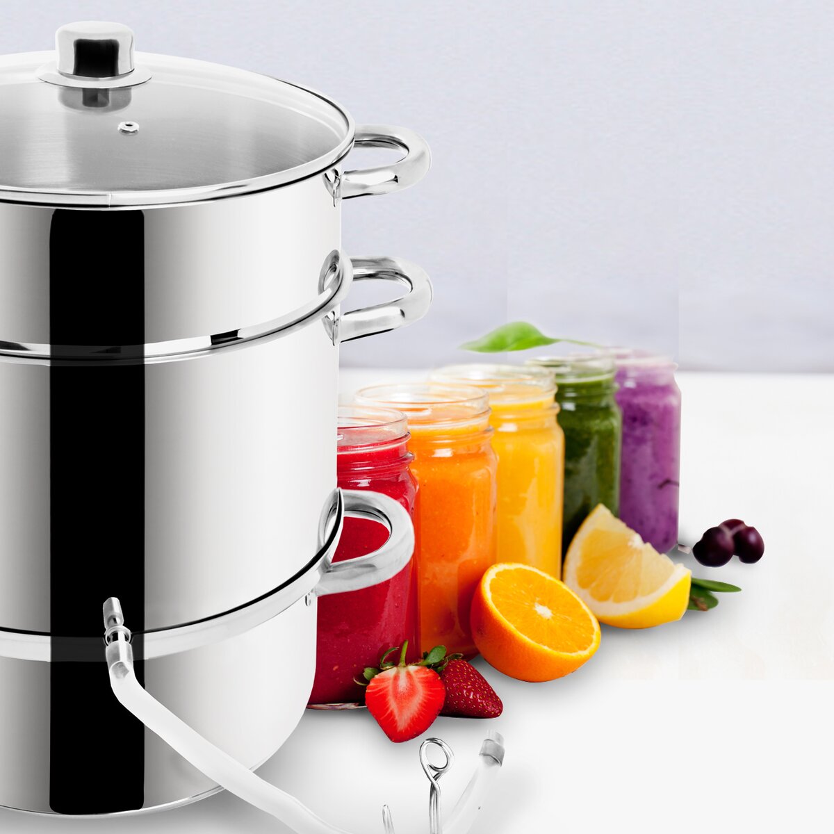 Viac informáciíTrojposchodový odšťavovací hrniec pre spracovanie ovocia zo záhradky, z farmárskych trhov alebo od pestovateľov a na výrobu lahodného džemu i sirupov.