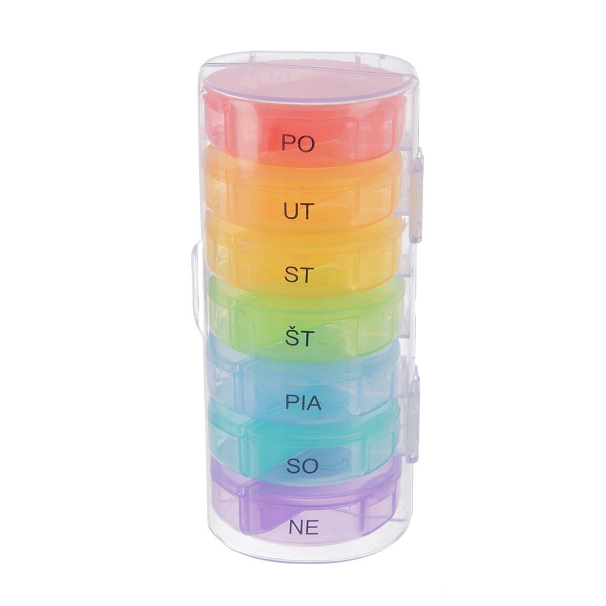 Kód produktu 811269Oblý plastový organizér na uloženie liekov na celý týždeň má vyberateľné dvojdielne sekcie so zatváracími viečkami. Sú rôznofarebné a prehľadne potlačené.