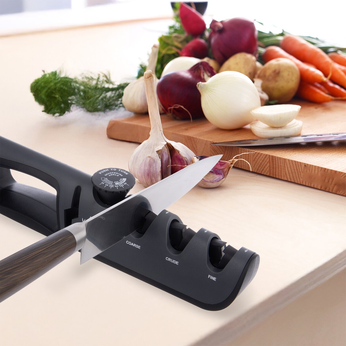 Kód produktu 141132Ostrič s tromi brúsnymi čepeľami umožňuje opracovanie čepele od hrubého brúsenia až k jemnému dobrúseniu. Regulátor otáčaním mení sklon brúsnych čepelí, čo zdokonaľuje brúsenie rôznych typov a veľkostí nožov. Brúska je určená pre kovové nože a vďaka špeciálnemu otvoru s brúsnym valčekom tiež pre nožnice. Základňa ostriča je vybavená 2 protišmykovými plochami, ktoré spoločne s ergonomickou rukoväťou zaisťujú pohodlnú a bezpečnú manipuláciu pri brúsení. Materiál: plast PP, guma, keramika, Tungsten oceľ (89-95HRC). Rozmery: 29x4,5x7,5 cm. Návod na obsluhu je súčasťou balenia.