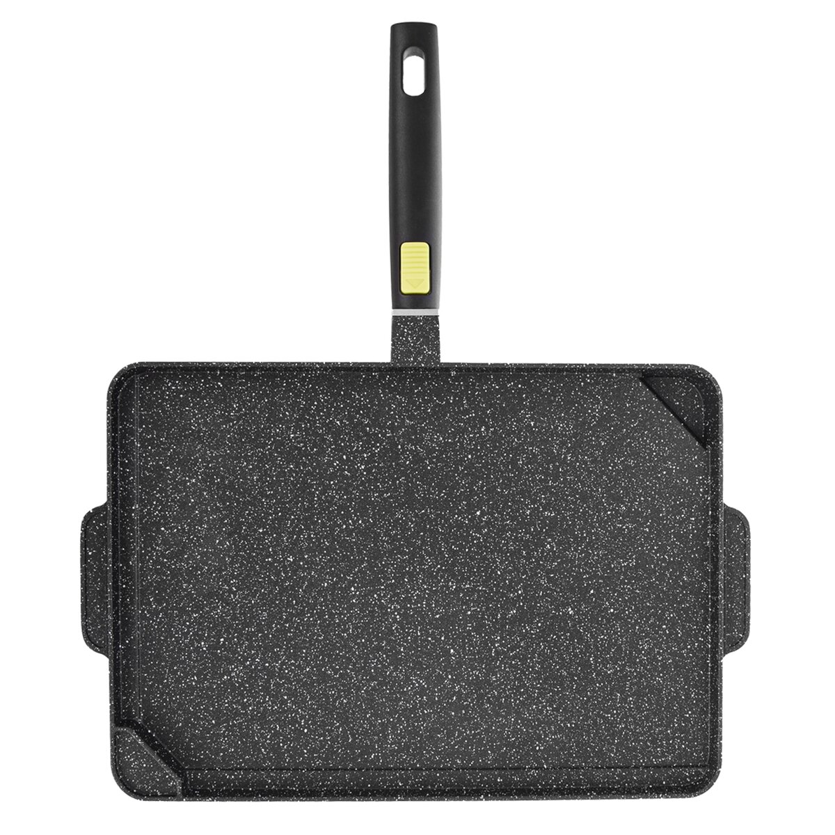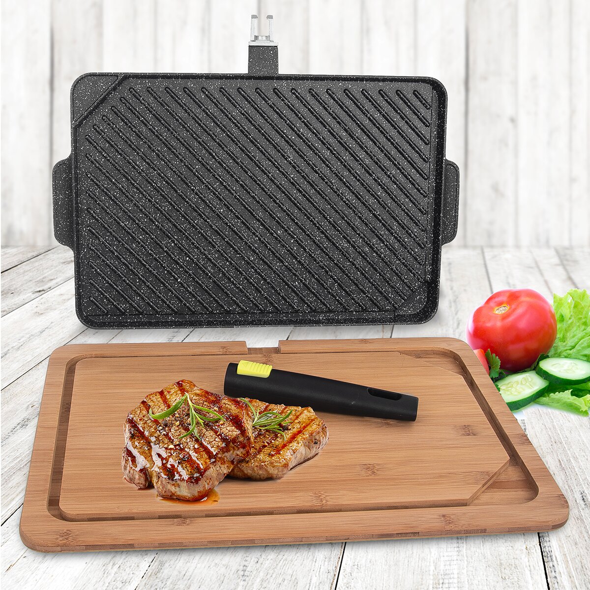 Kód produktu 112977Nepriľnavá grilovacia panvica, na jednej strane hladká, z druhej s vrúbkovaným povrchom pre prípravu steakov, rýb aj zeleniny na všetkých typoch sporákov, v rúre aj na grile. Doplnená odopínacia rukoväťou a doskou, ideálnym pre servírovanie.