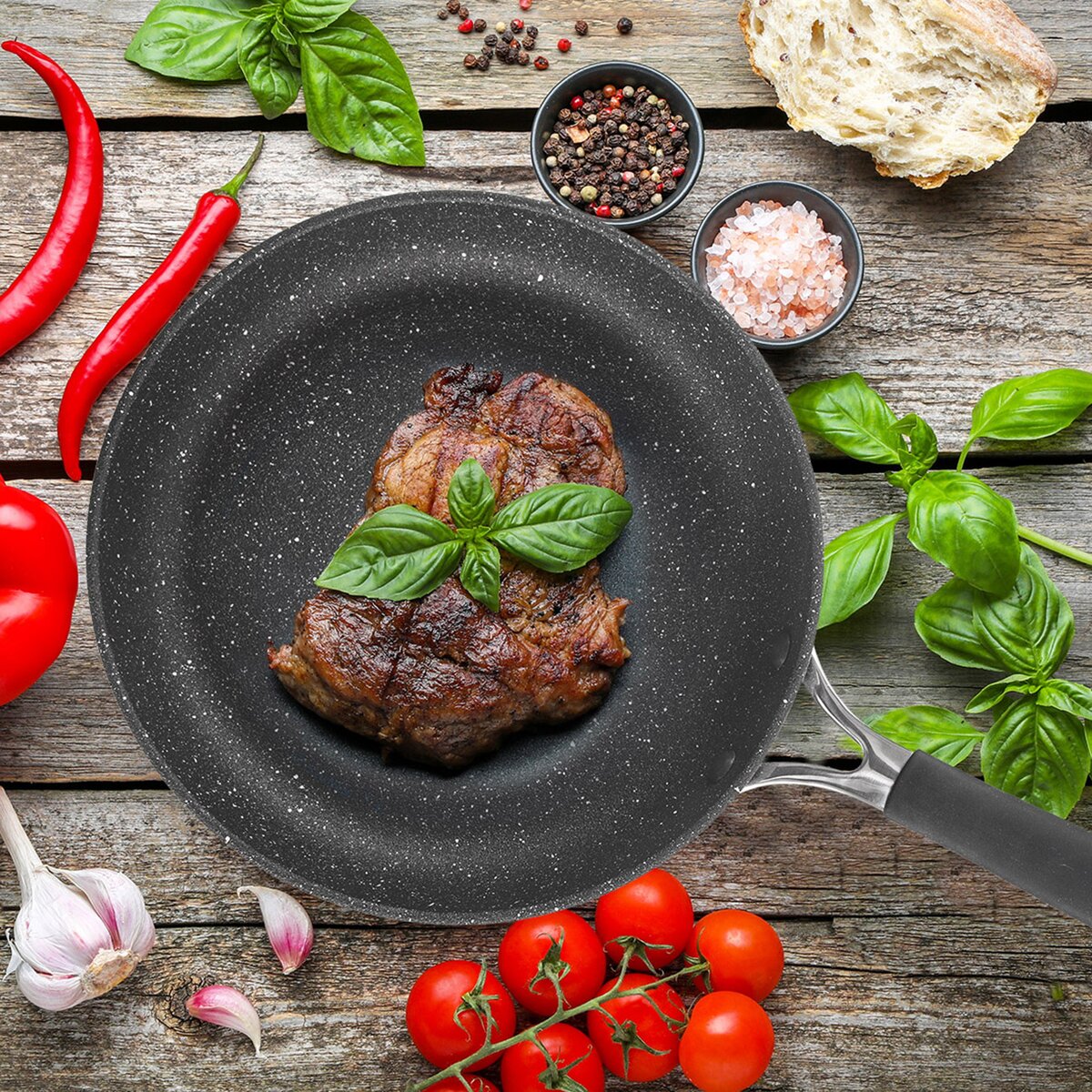 Panvica STONER pr. 24 cm prekvapí hrubým povrchom na vnútornej strane, so štruktúrou a charakterom hrubého nelešteného kameňa. Olej alebo výpek sa totiž vďaka hrubému povrchu lepšie dostane pod pripravované pokrmy a suroviny budú rovnomerne prepečené.