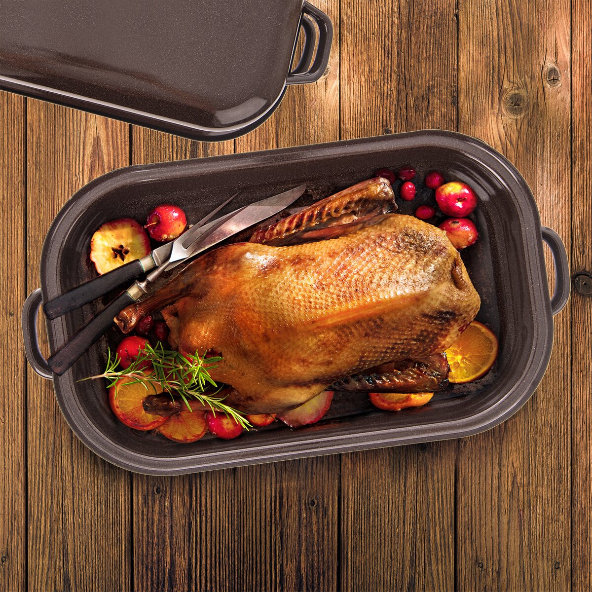 Šťavnaté pečené mäso, plnky, nákypy a pod. Pečieme prikryté poklopom, po sňatí veka sa vytvorí krásna kôrka. Klasické kysnuté buchty ako z rozprávky a iné dobroty sa dajú piecť samostatne v oboch dieloch, veko tak bude slúžiť ako samostatný pekáč o čistom rozmere plochy na pečenie 32,5x20,5x6,5 cm. Celkový rozmer oboch dielov aj s držadlami je 37x20,5x12,5 cm.